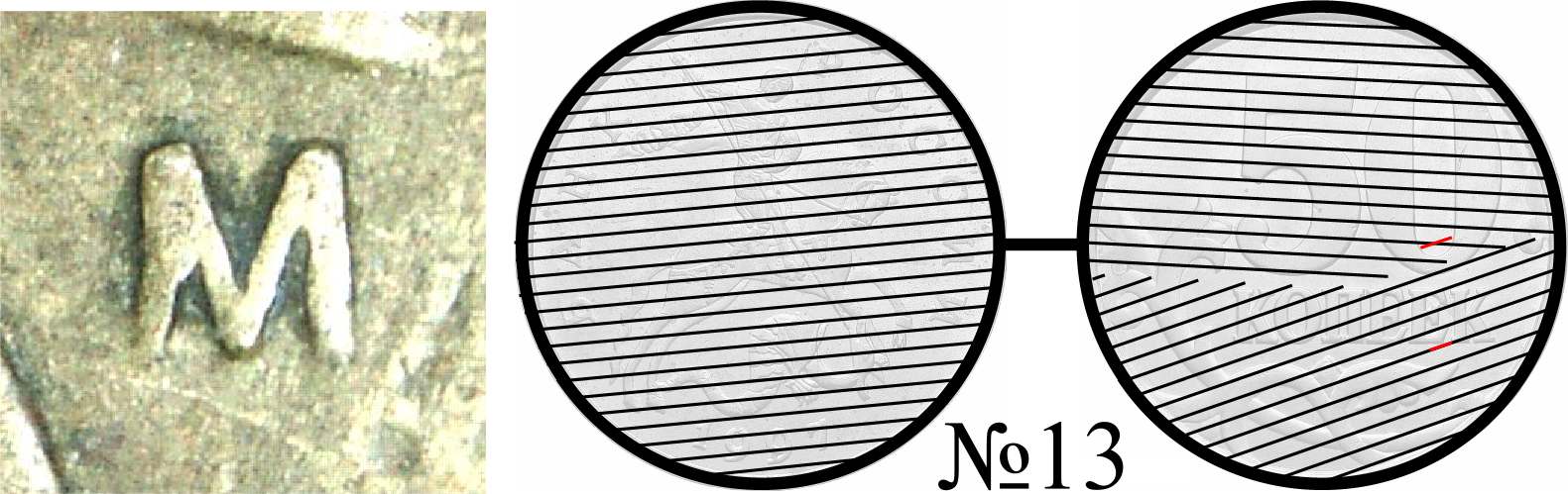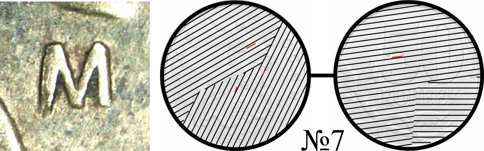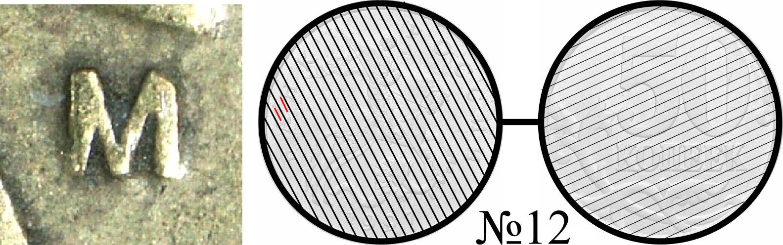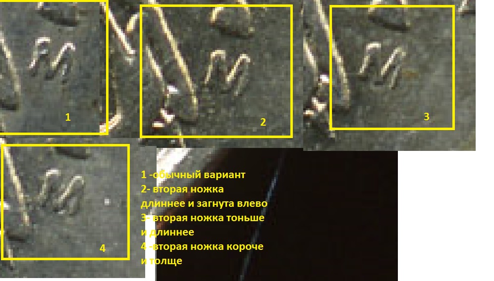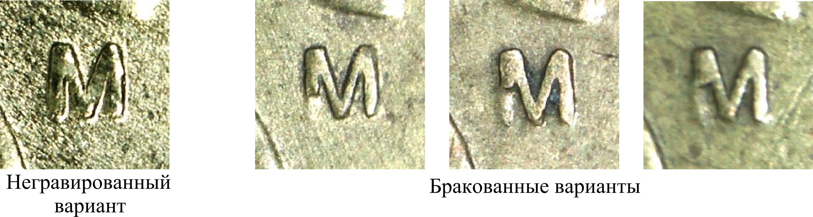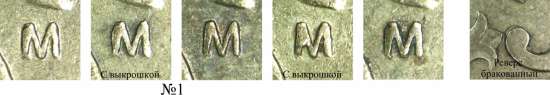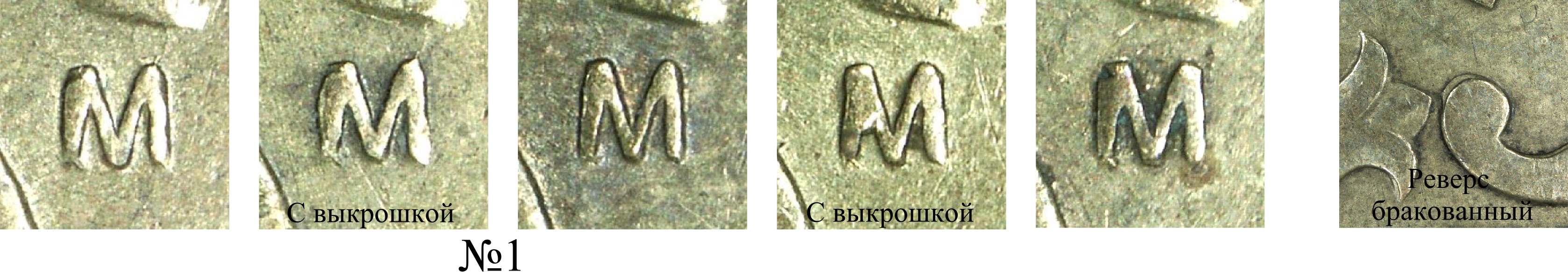 По сути: по видимому, на некоторых промежуточных маточниках разрушалась левая ножка буквы «М». Часть рабочих штемпелей подверглась гравировке в попытке восстановить адекватный вид буквы минтмарки. Получилось то, что получилось. Один вариант гравировки (№1) правился не на рабочем штемпеле, а на промежуточном этапе тиражирования штемпелей. Незначительные отличия этого варианта связаны с износом и разрушением рабочего инструмента, а некоторые кажущиеся отличия – результат оборота монет. Известно не менее 20 штемпельных пар варианта №1. Фото этой гравировки прилагается без шлифовок. Один рабочий штемпель этого варианта работал в сочетании с бракованным реверсом.