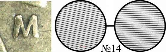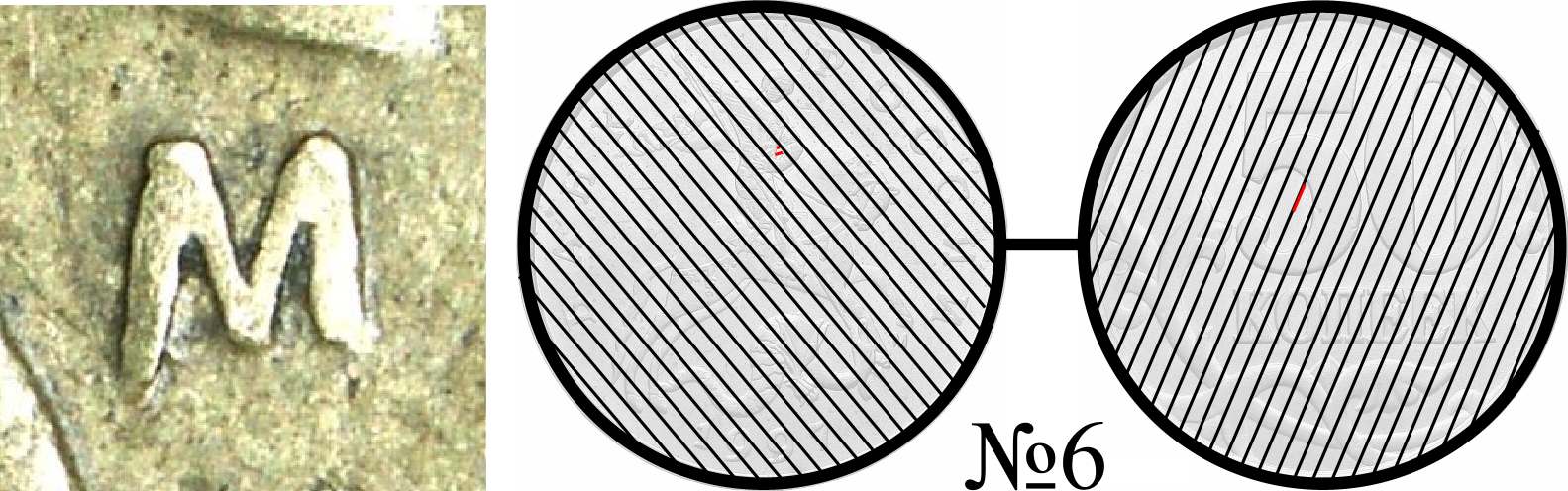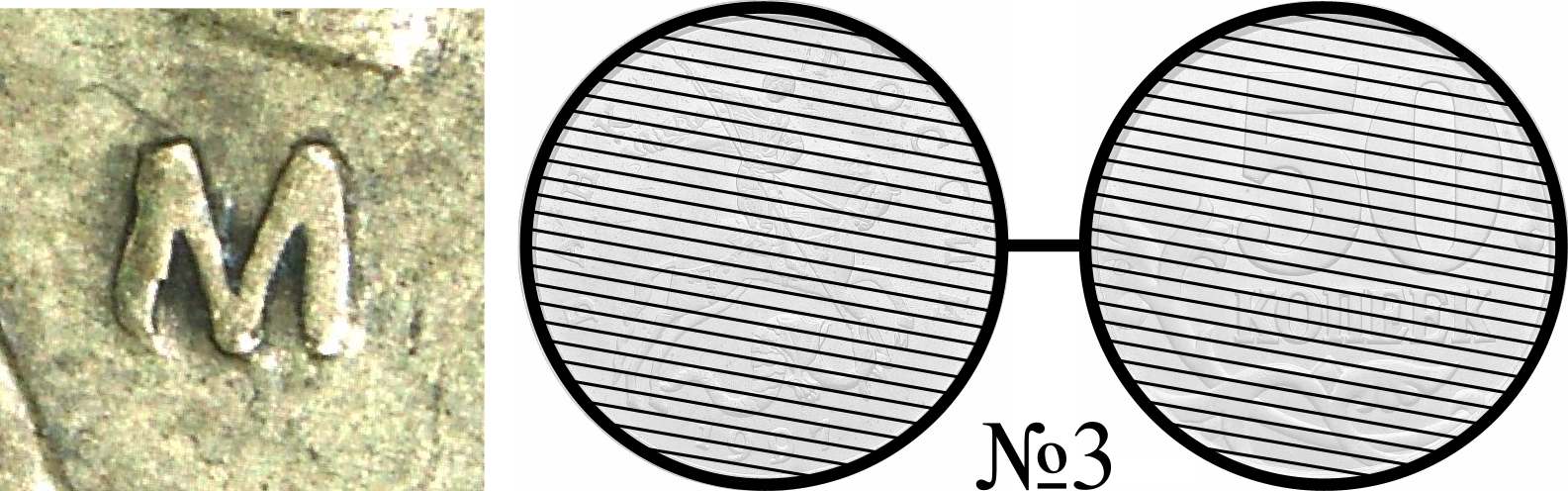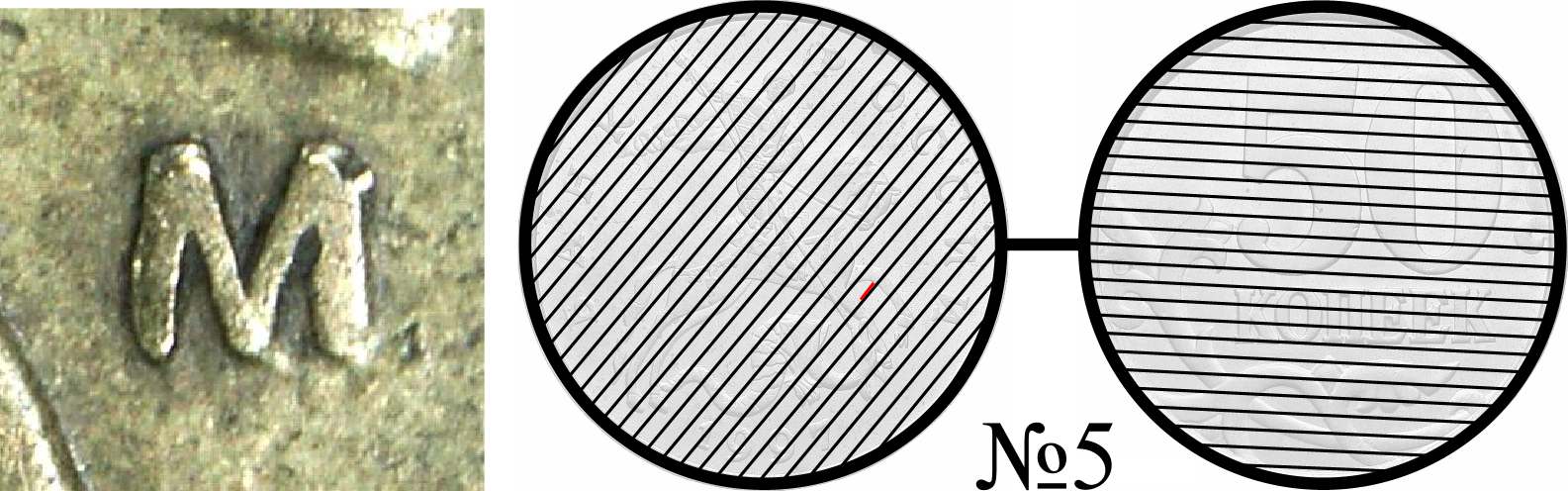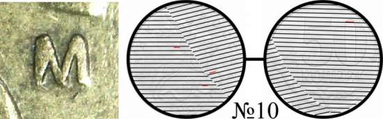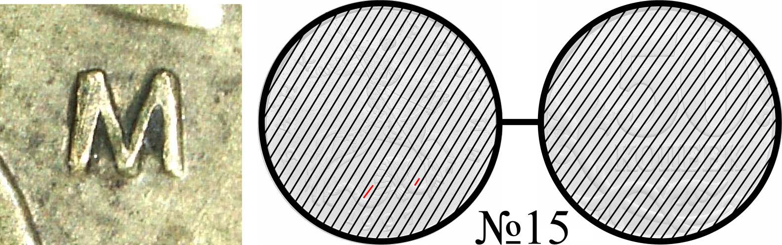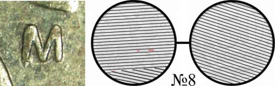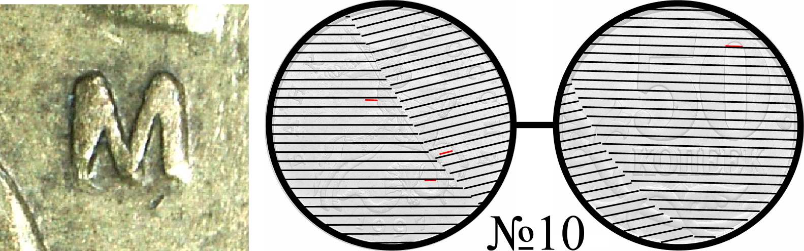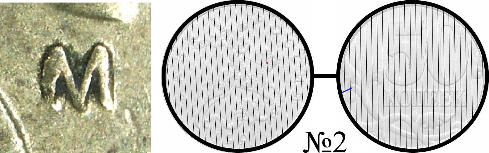 По сути: по видимому, на некоторых промежуточных маточниках разрушалась левая ножка буквы «М». Часть рабочих штемпелей подверглась гравировке в попытке восстановить адекватный вид буквы минтмарки. Получилось то, что получилось. Один вариант гравировки (№1) правился не на рабочем штемпеле, а на промежуточном этапе тиражирования штемпелей. Незначительные отличия этого варианта связаны с износом и разрушением рабочего инструмента, а некоторые кажущиеся отличия – результат оборота монет. Известно не менее 20 штемпельных пар варианта №1. Фото этой гравировки прилагается без шлифовок. Один рабочий штемпель этого варианта работал в сочетании с бракованным реверсом.
