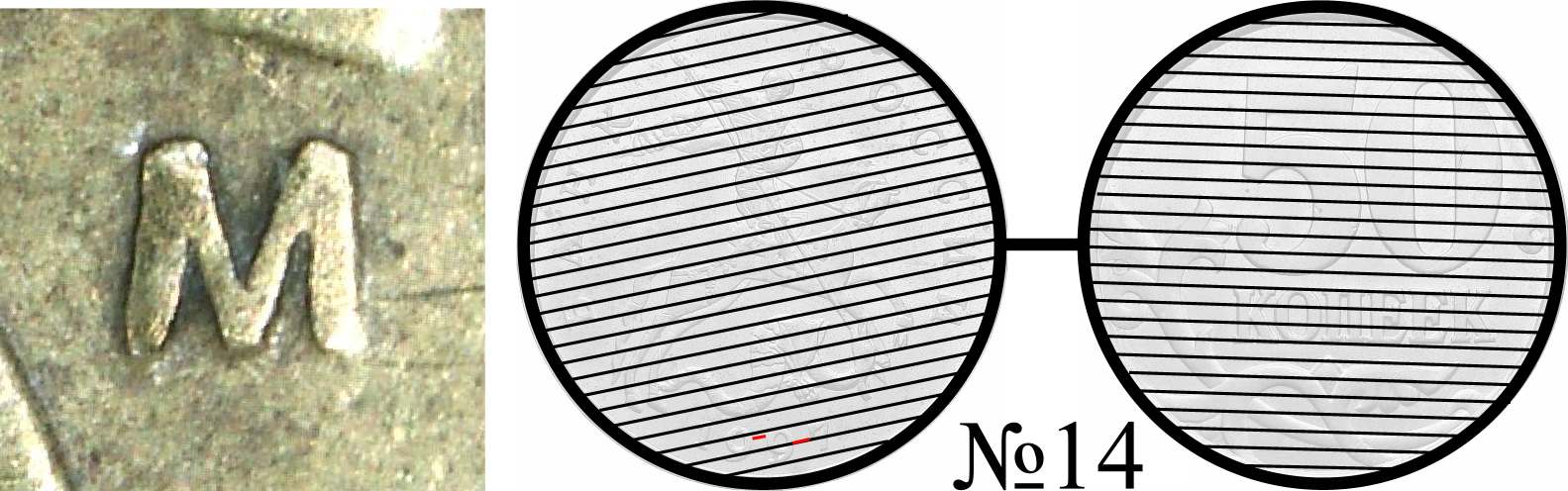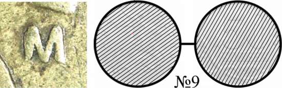 Судя по тому, что монетка чеканена одной Штемпельной парой и Тираж у нее был достаточно ВЕЛИК, почему бы не предположить, что на этом Разновиде тоже Гравировали буквы М ???