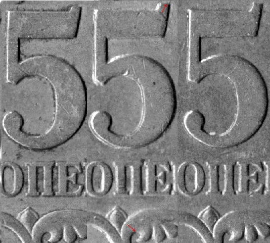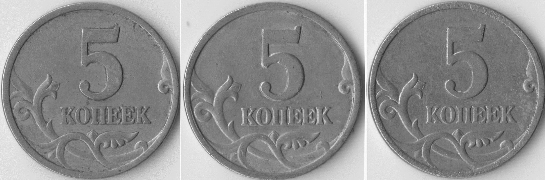 К тому же, на левой монете хвостик верхней гасты пятерки короткий, тогда как на центральной и правой - длинный.