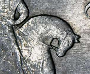 "Буква тонкая, повёрнута против часовой стрелки и приближена к левой ноге коня, поводья выраженно разделены (шт. А2)"