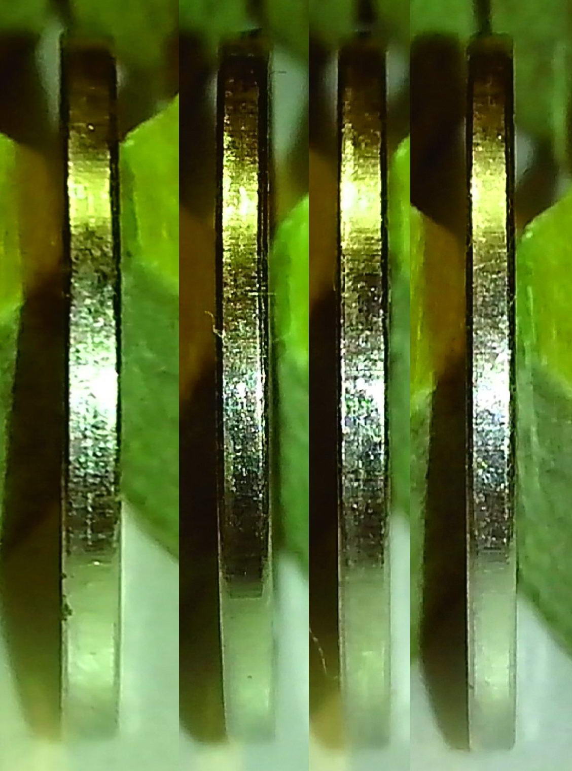 По фотографиям можно сказать, что монеты подобраны разные. Самое простое объяснение (а значит и самое вероятное): верхняя копейка отличается от других, не потому что она особенная, а потому что у остальных гурт уже начал корродировать.