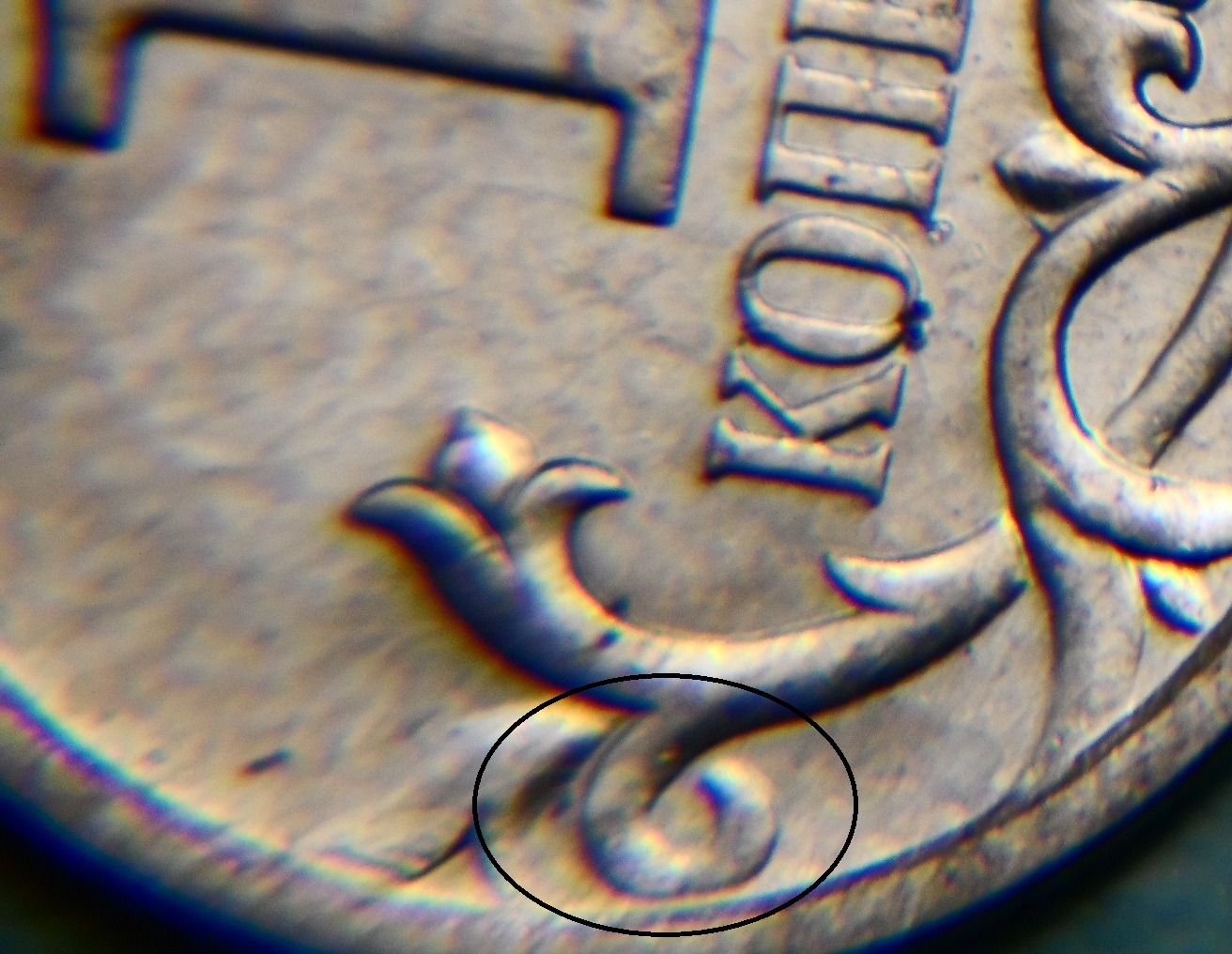 Поэтому в случае затруднения нужно оценивать всю совокупность отличий штемпелей. Посмотрите описания 2007 года, подробные описания реверсов и сравните свое фото с полноразмерными фото реверсов из каталога. Обратите внимание на саму форму завитка и резко заниженный рельеф элементов рисунка в районе завитка.