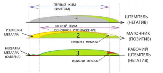Нижний штемпель должен находиться в неподвижном состоянии или же используется "встречнопоршневая" схема движения штемпелей, что более вероятно. В этом случае нижний штемпель(не бьющий) не выталкивает монету а отходит...чуть ниже стола, с подачей заготовки он возвращается и делает "упор" под бьющий штемпель. Два вида рассинхрона - межштемпельная и сбой с подачей заготовок(проскакивание привода) могут объяснить буквально все виды двоений.