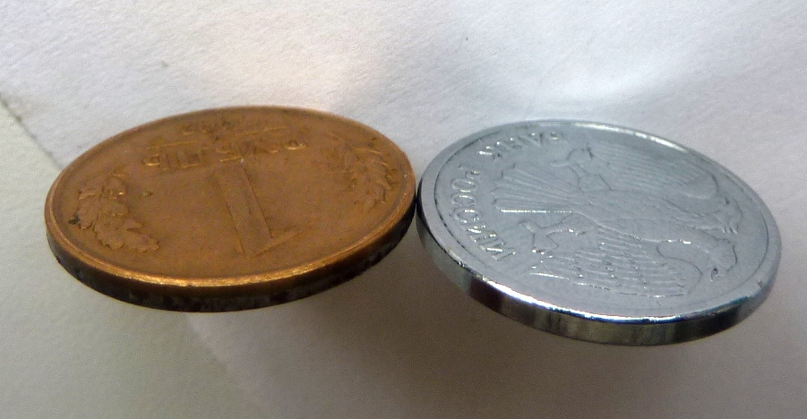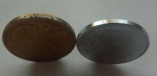 Когда менял в магазине кучу 5р своих на ихние,мне подсунули 5 копинок,они по диаметру схожи.ещё. В школе натирал трешки озотно-кислым серебром1/1получилась двадцатка.
