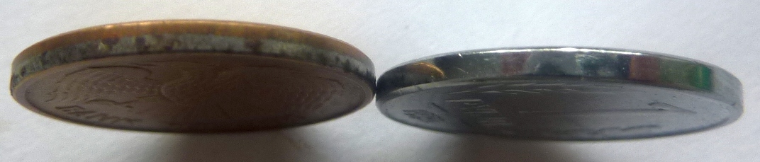 В середине 60-х годов "раскрашивание" желтых монет в "белый" цвет входило в школьный курс химии. Не помню во что их макали, но покрытие держалось прекрасно - у меня лет 30 хранился 2х копеечный образец. Слегка магнитился. Потом был утрачен в белокаменной. Но о нём не сожалею.