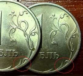 Доброго времени суток. Попался рублик 1997г. с некими отличиями в деталях чеканки (он снизу) верхний обычный для примера(фото на скорую),особенно выделяется лист посередине с разрезом (не царапина,а именно чеканка такая),ну ещё некоторые отличия выделил. Отметил,но ещё не все. По каталогу кроме широкого канта нет разновидностей других в этом году. Ваше мнение,уважаемые форумчане.