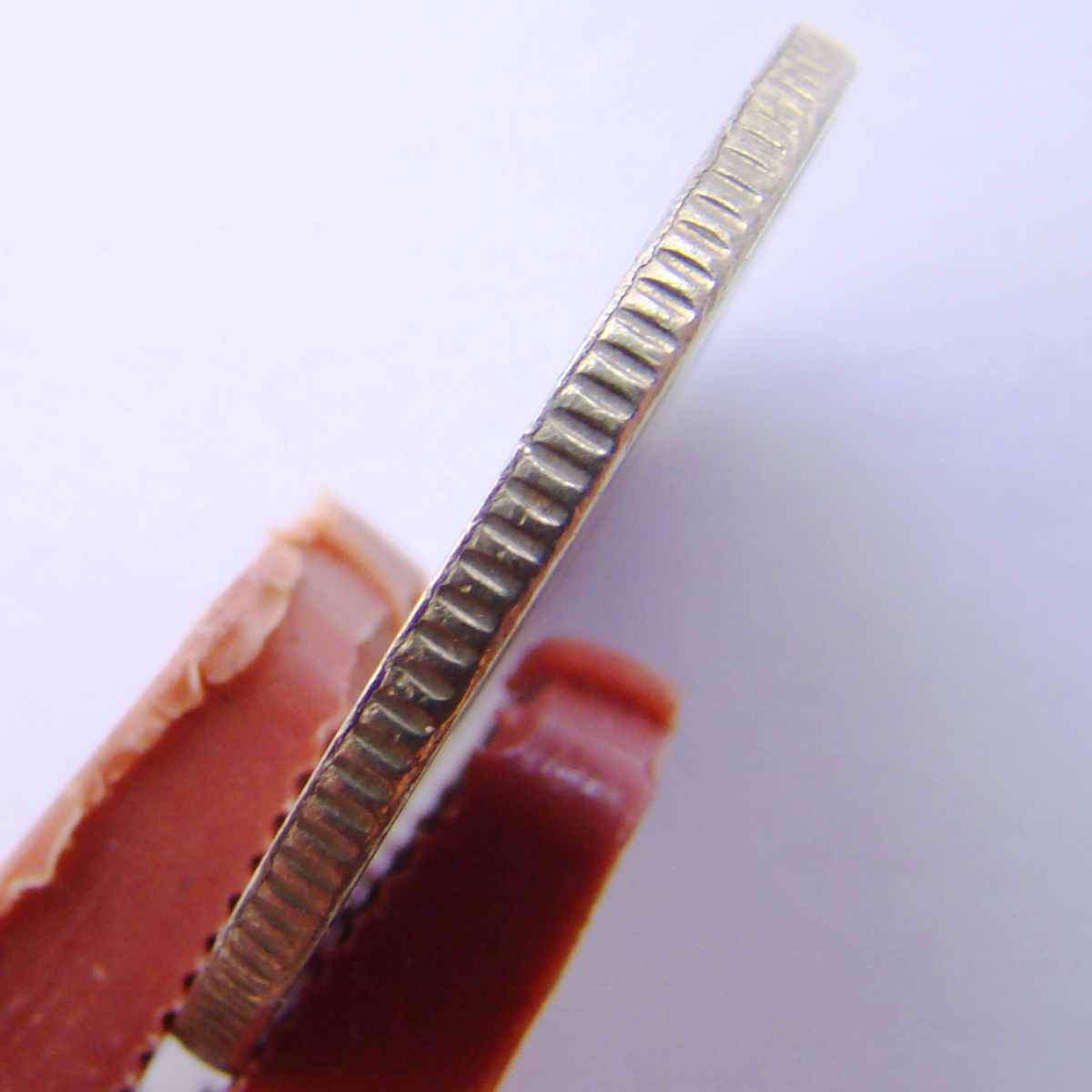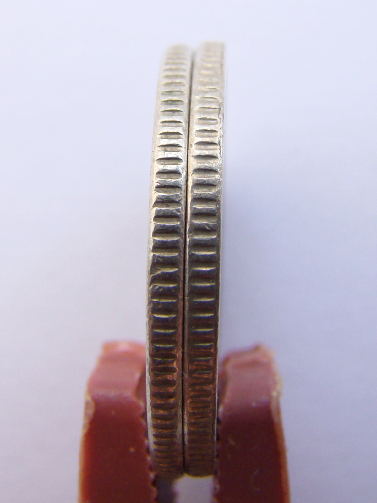 Сделайте, пожалуйста, качественный снимок (можно скан) гурта. И второй - гурты двух монет вместе. И было бы неплохо промерить не только диаметр, но и толщину монеты по канту и не штангенциркулем, а микрометром.