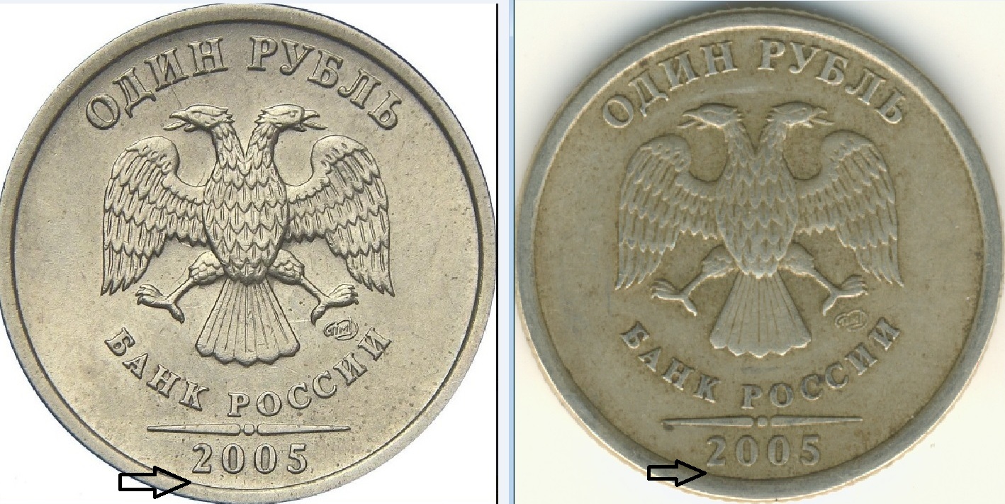 монетка та, что справа. На хвостике пятерки круглая точка, верхняя надпись один рубль чуть дальше чем на левой