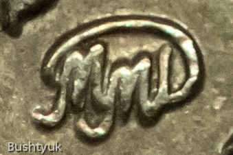 Макро фото, показали, что разница между монограммами, практически нет. Отличается, только высота и толщина правой ножки, первой буквы М, что на мой взгляд, может объяснятся износом штемпеля.