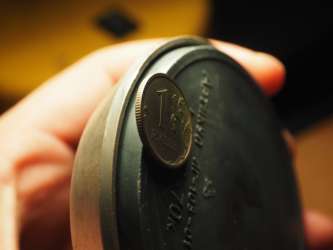 На фото где три монеты: магнитная слева, обсуждаемая в центре и не магнит справа.