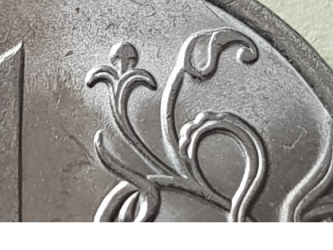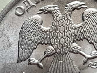 Лист с права без проризей как не крутил монету и при искуственном освещение отчетливо видно с задней стороны еденицы как будто вторым слоем какое-то слово и вообще 2-ое изоброжение. От левого языка орла идет как будто бы пламя к букве Д, а так же левое крыло с длинными прорезями. С низу от еденицы на нижних листьях брак на фото видно. Фото при фотографирование очень много весит и поэтому сюда не вставляется. И по аверсу не определяется. Фото при интересе могу в полном объеме скинуть на личку. Помогите разобратся