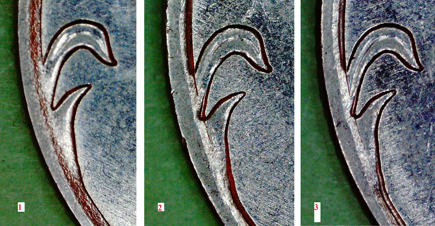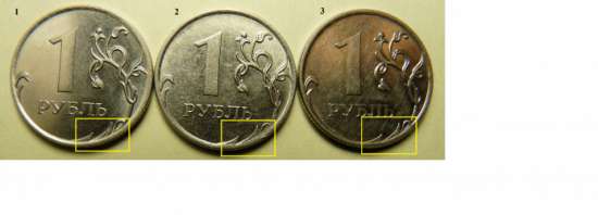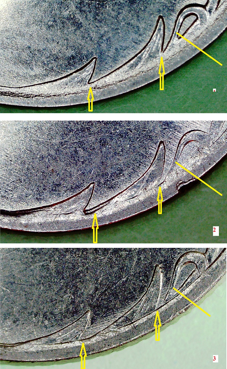 2) сильная подшлифовка (видимо, предыдущего штемпеля) - монета №3.