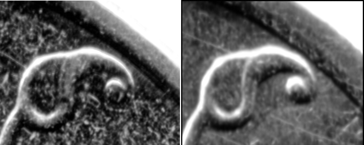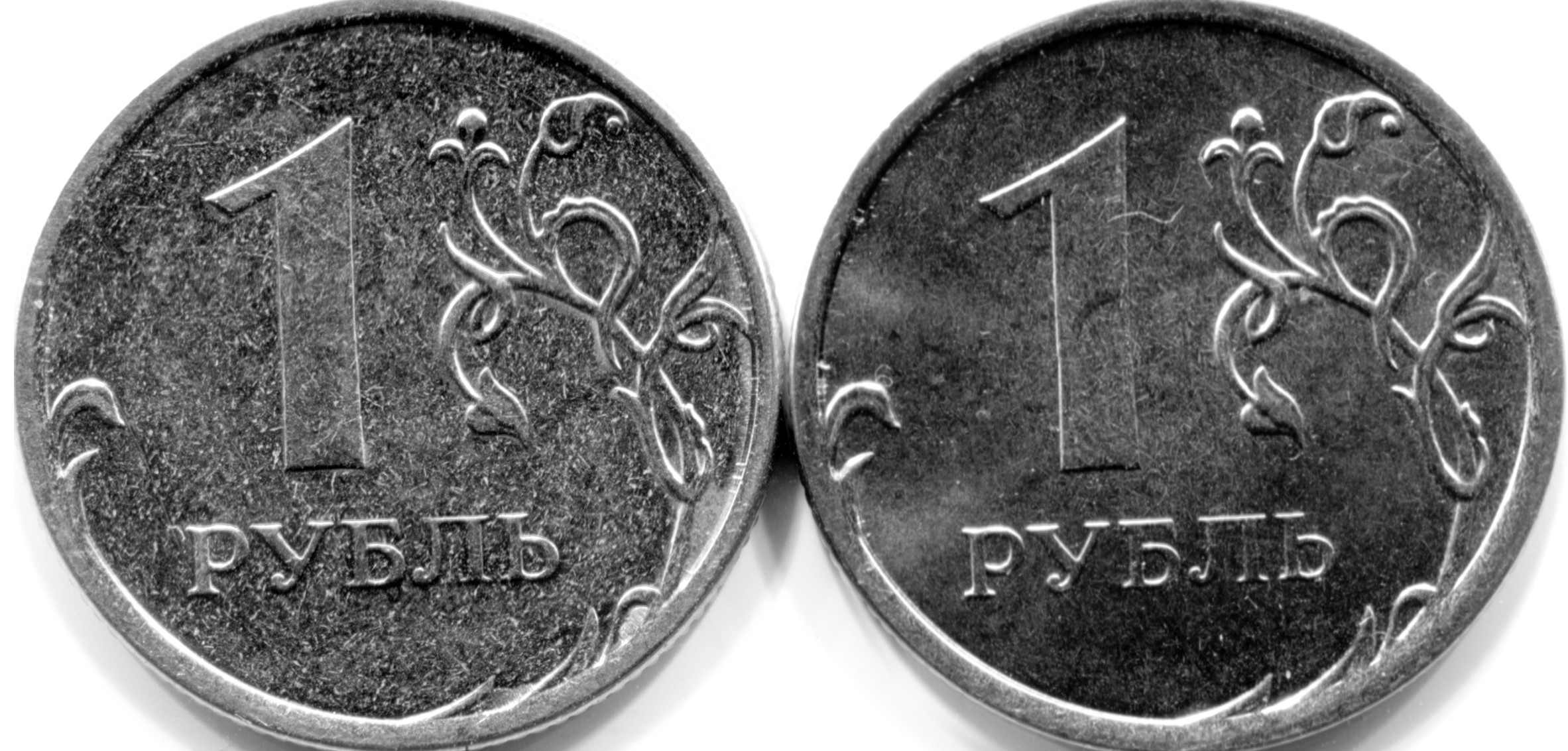 Подскажите - 1 рубль ММД монеты 2013 года. Но вот у одной лист более удален от канта и лист сам посебе выглядет тоньше. Монеты сканировал.