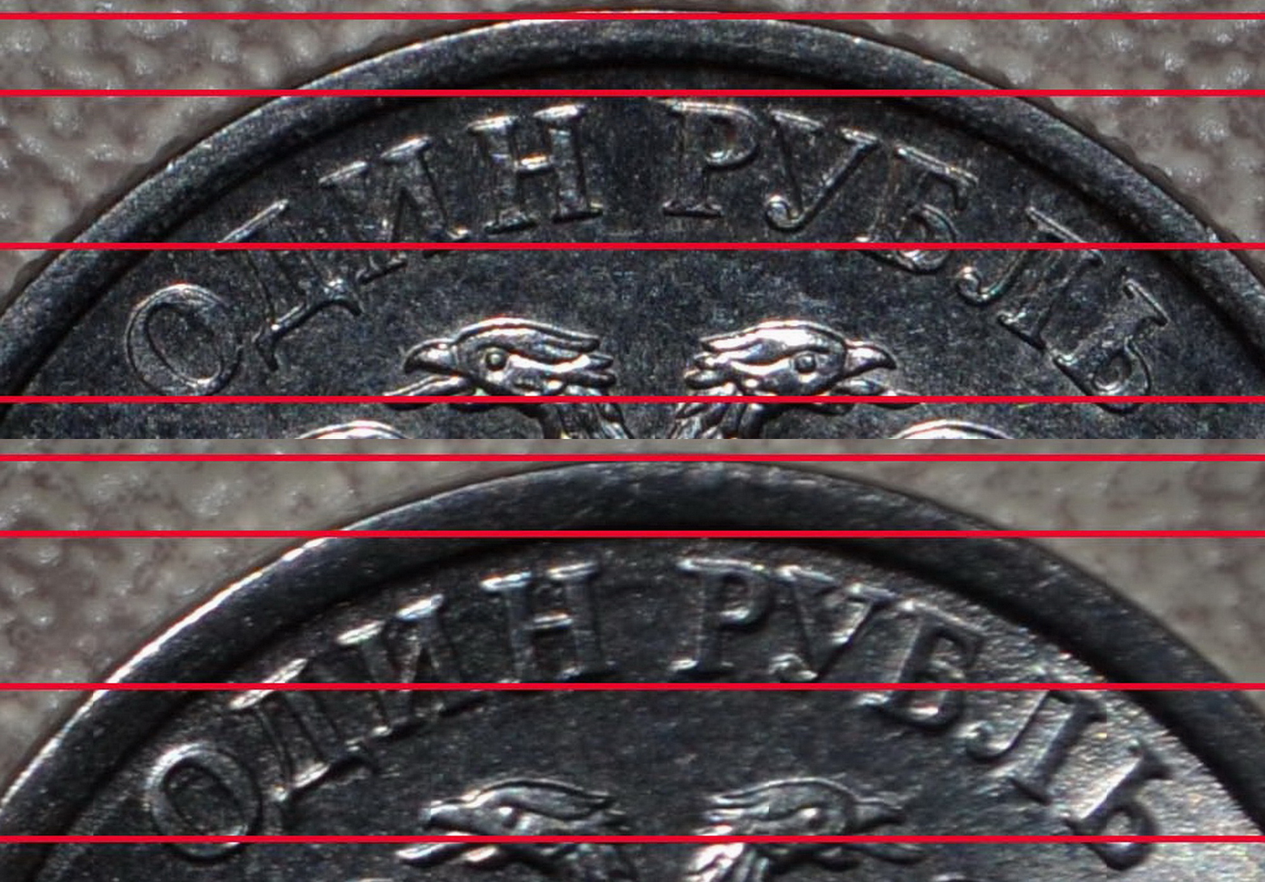 Надписи ОДИН РУБЛЬ и цифры номинала очень толстые!!! Линии над датой касаются точки!