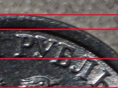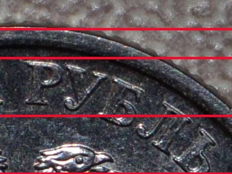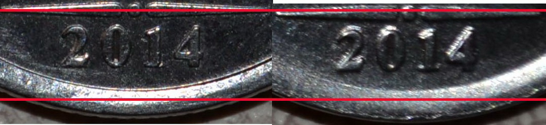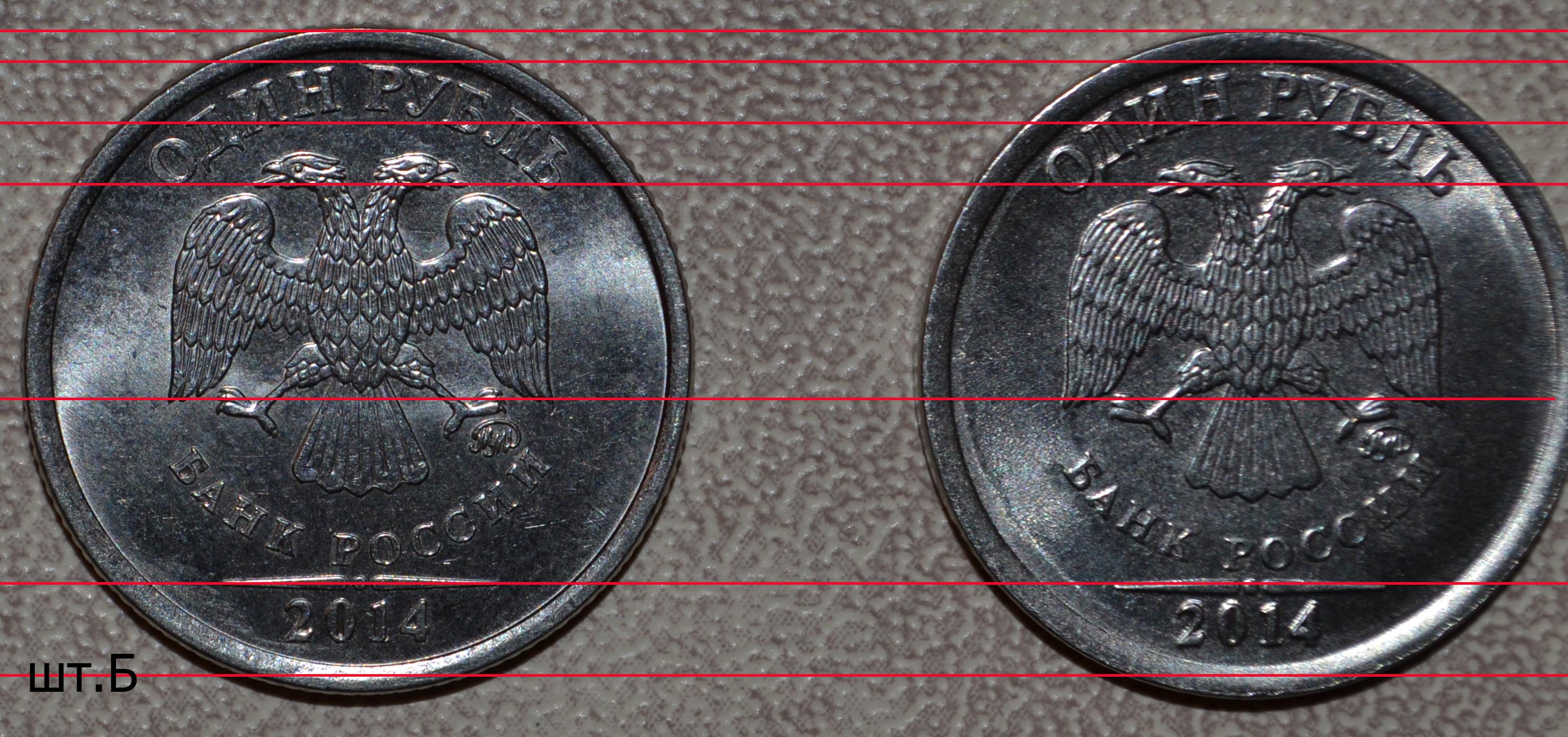 У шт. Б буквы шире, расположены дальше от канта. О расположении монет: расстояние от нижней красной линии до границы канта у монет одинаково.
