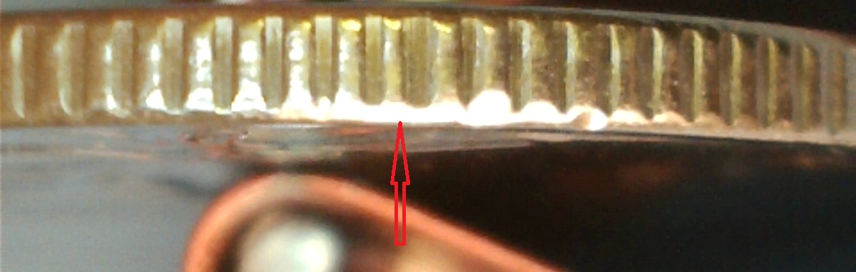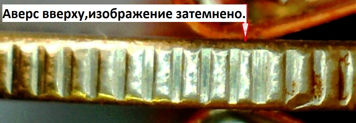Монета расположена аверсом вверх.Гурт очень похож на гурт IIб.Смущают рисочки с правой стороны от узкого рифа.И высота самого узкого рифа.