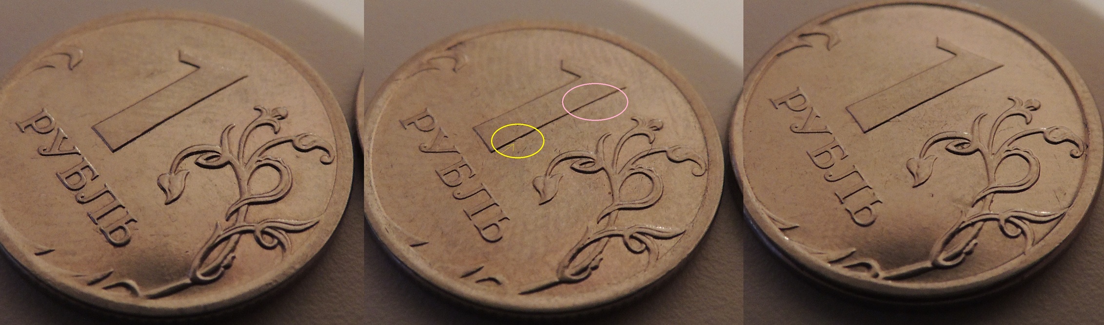 Обнаружил одинаковый дефект на монетах 1 рубль ММД 2010, 2013, 2014 годов. С чем это может быть связано, разве столько лет могла использоваться один и тот-же штамп? Жёлтый овал на фото. Розовый овал - тоже одинаковый дефект но на фото его вообще невидно. На фото монеты лежат по порядку 10, 13, 14. На 2010 году плохо различим дефект, на 2013 сильнее, на 2014 очень хорошо видно. Штамп старел но не выбрасывался)).