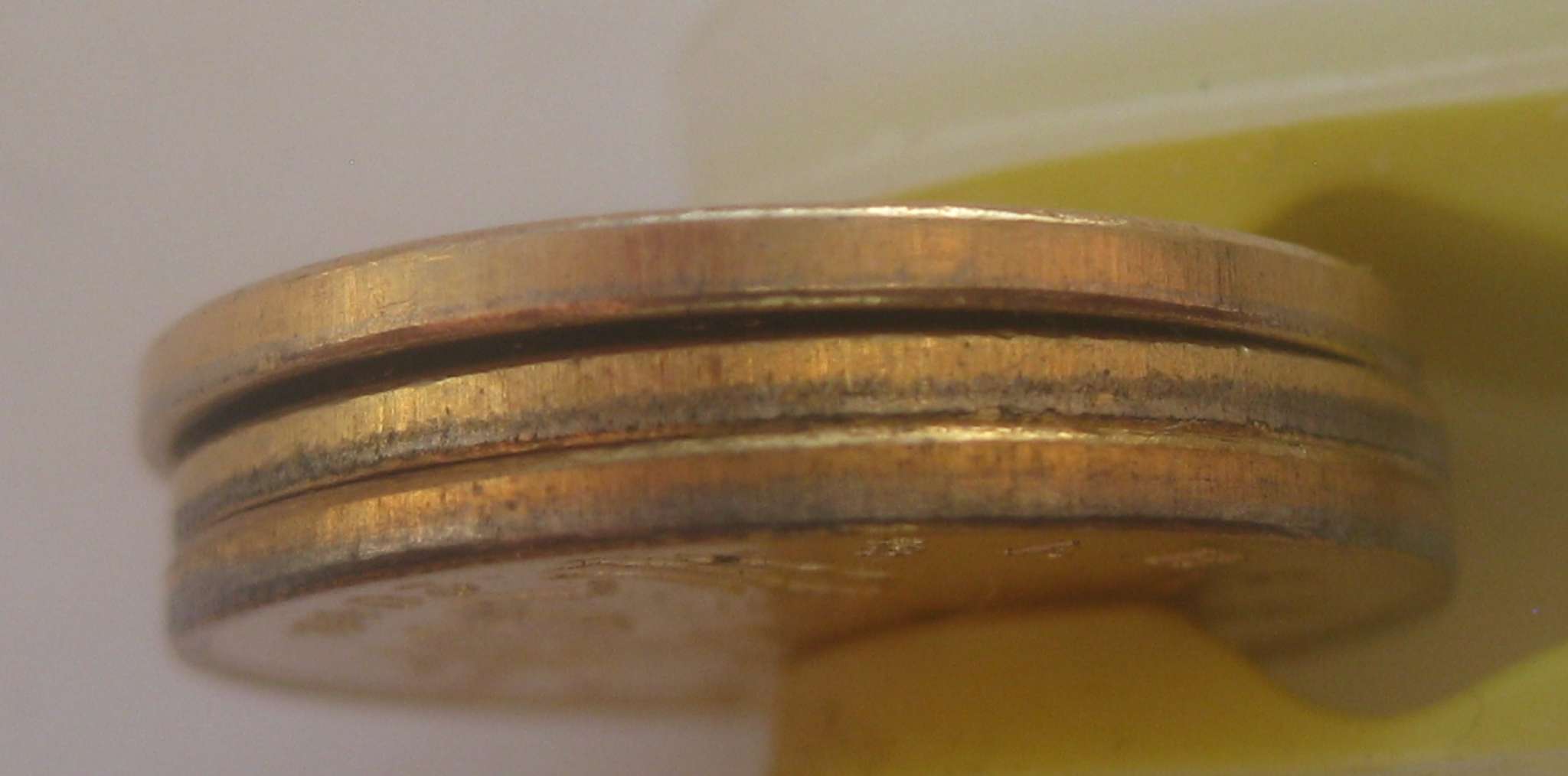 Всё же надо макросъёмку гурта этой монетки, без остальных. Очень похоже на правду, но несколько напрягает неравномерный отход плакировки от сердечника на нижней стороне монетки и чуть грубоватый переход границы натянутой вырубкой плакировки и стали.