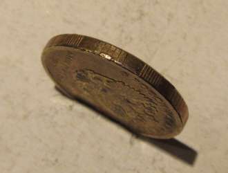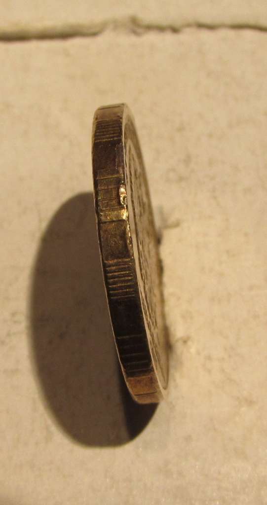 Доброго времени суток,.вот попалась монетка с браком гурта,похоже на отслоение плакировки или гальваники?имеет ли место брак такого вида на данных монетах?Спасибо.Попалась первый раз,поэтому возник вопрос.
