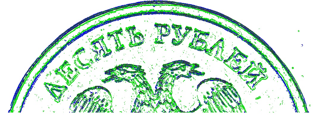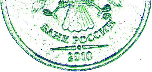 Выполняя свои обычные операции по контролю изображений, наткнулся на вот такой аверс. Сначала смутил формат букв в слове "ДЕСЯТЬ РУБЛЕЙ"- верхние перекладины у "Б"и "Е" выглядят явно вогнутыми. Совмещение изображения со штемпелем "А" показало, что размеры определяемого штемпеля несколько больше, в то время как я считал штемпель "А" самым большим, по крайней мере у меня так получилось при наложении фотографий, размещенных на этом сайте.