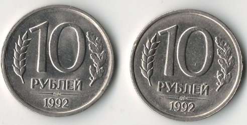 Здравствуйте. Подскажите, пожалуйста, одинаковые ли это или всё-таки разные штемпеля аверса 10 рублей 1992 спмд? 1.1 или 1.2. Не могу определиться окончательно.