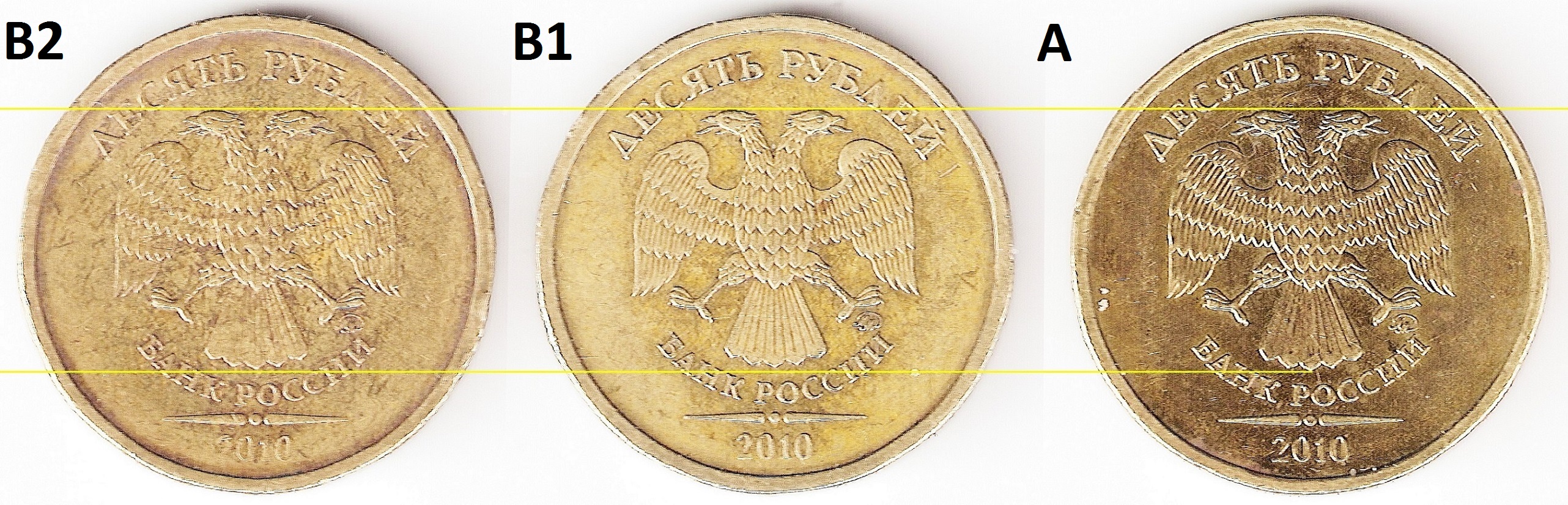 Посмотрите, пожалуйста, штемпели правильно мною определены. Две монеты с левой стороны. На скане аверсов провела линии, чтобы убедиться, что изображение на этих монетах меньше, чем на на шт. А (монета с правой стороны)