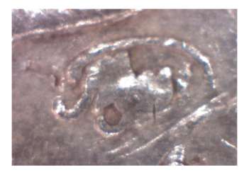 В монетке ничего странного не вижу. Просто её сильно потрепало в жизни. На монограмме