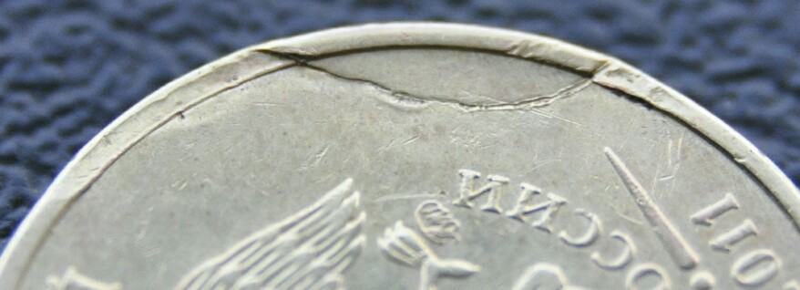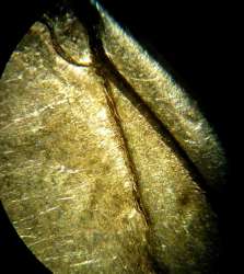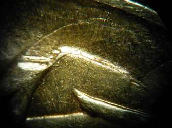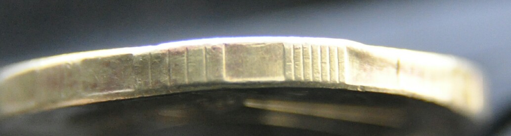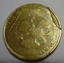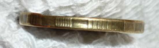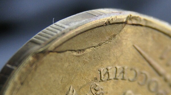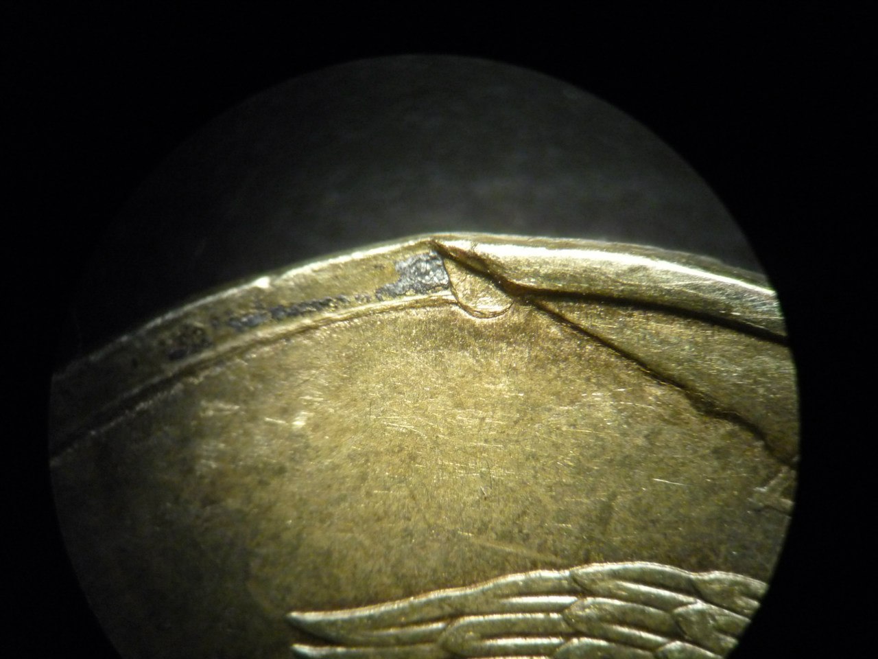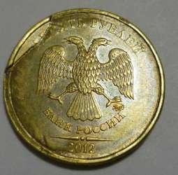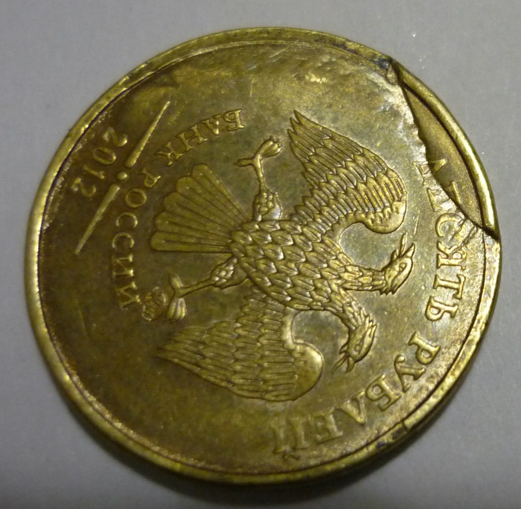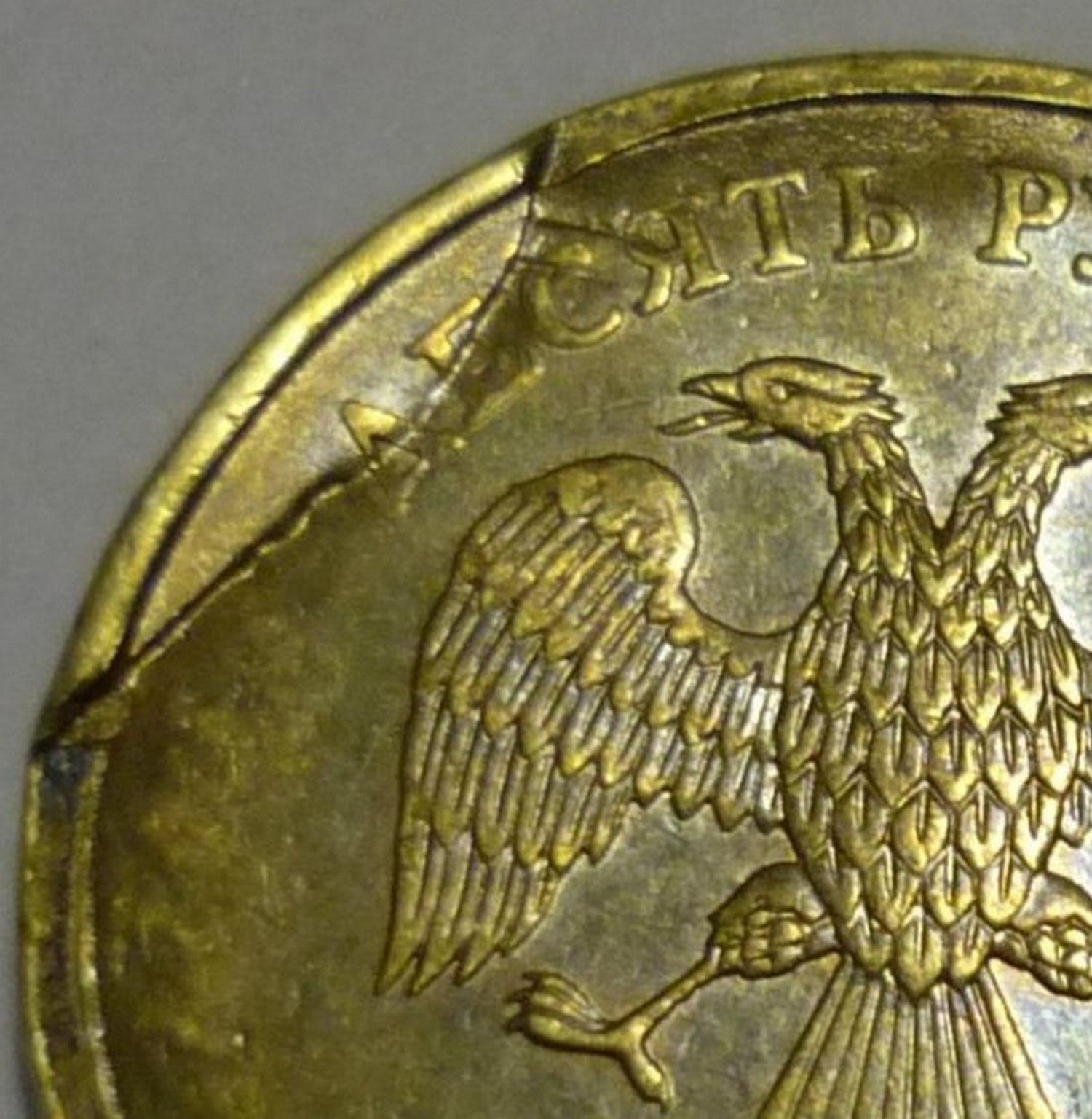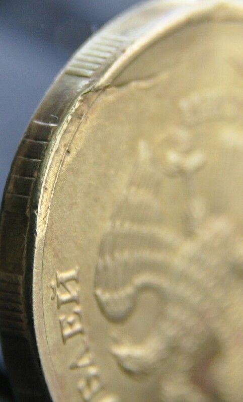 А вот с права и с лева от этого участка кант деформирован , на него и пришёлся ,, ответный,, удар . На вашем фото гурта видна деформация на этих участков . Кант у монеты сильно выступает от поля , поэтому рисунок и не пострадал практически ( орёл жив ) .. а вот ниже ,, линии раскола ,, , вдоль неё и выше поле монеты всё же задело (деформация надписи и самого поля на этом участке заметна - вот вам и следы от удара по реверсу ) . .. Как то так . Попробовал объяснить Вам как вижу . С уважением .... Да , единственное дополнение - удар мог быть нанесён не по реверсу , когда монета лежала на аверсе , а наоборот ..