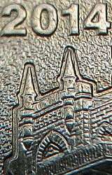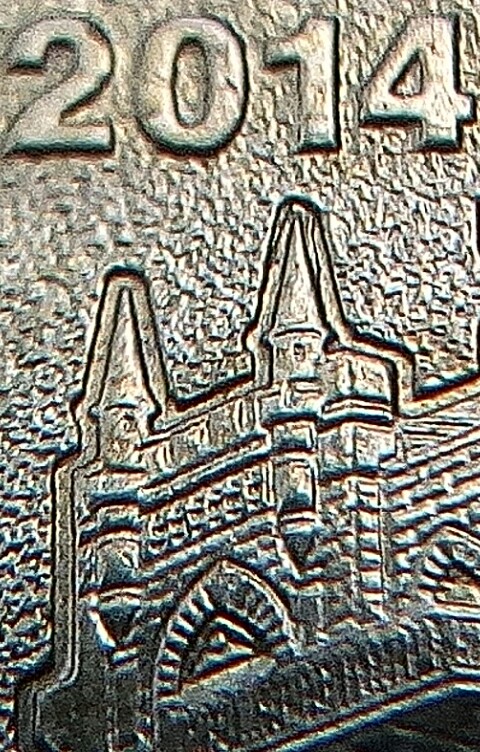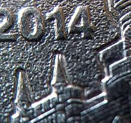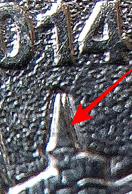 Шпиль этот точно в центре. Низ даты плохо видно на фото, но точки в ней явно задавлены фоном почти на половину в нижней части. Сравните с обычной монетой живьём, если низ даты над шпилем на монете в теме забит рисунком поля - дефект возник при выталкивании готовой монеты из кольца и искать 2-ю точно такую - тщетно.
