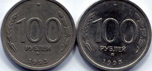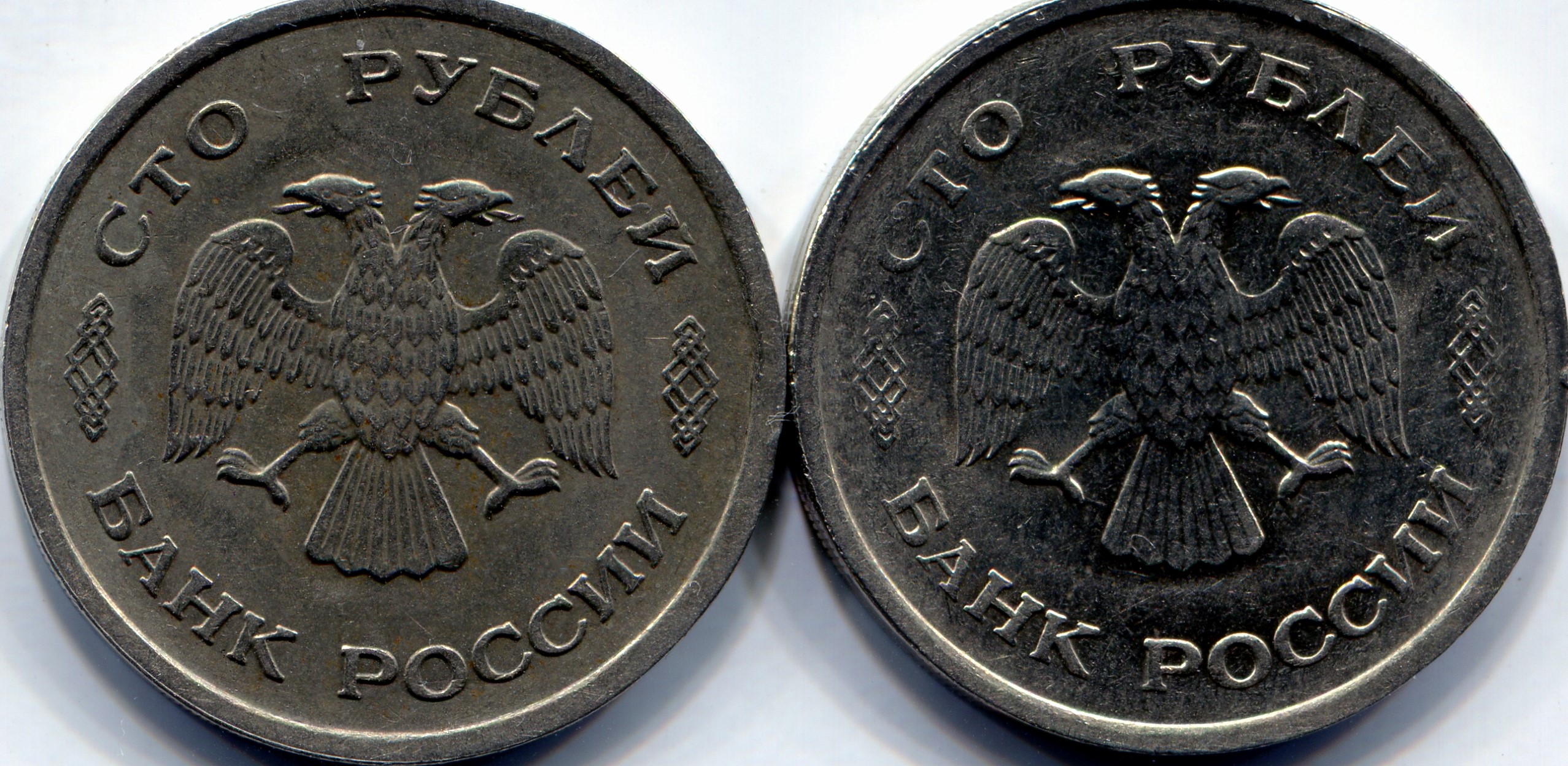 Сравните пожалуйста 2 монеты 100 руб. 1993 ММД . Со стороны орла поле монеты вроде больше у левой монеты . Спасибо .
