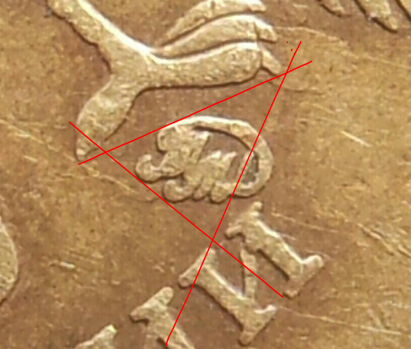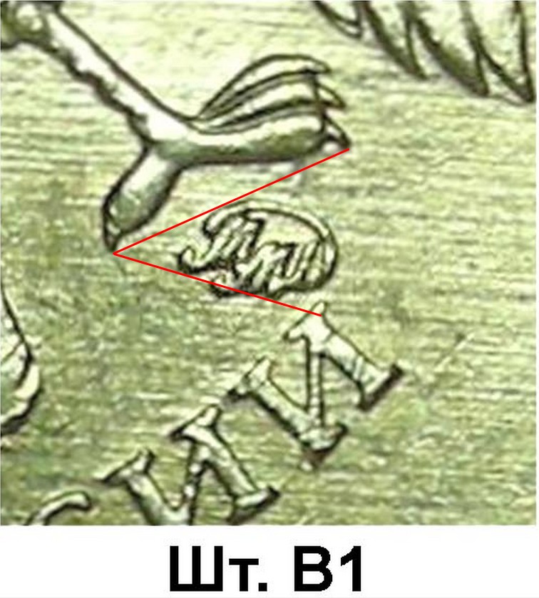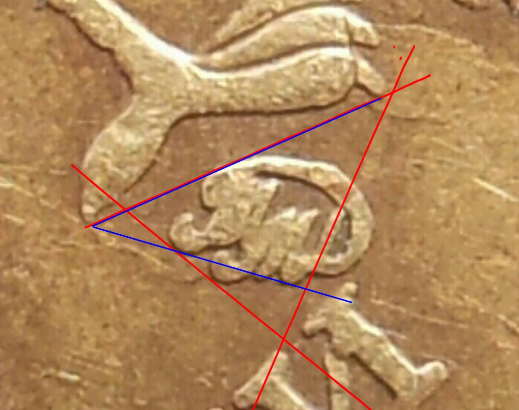Знак монеты слегка примят.После проведения линий получилось что получилось, но не то что в каталоге.Сам склоняюсь к В1. Помогите развеять сомнения. С уважением.