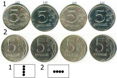 2) Не правильно. У Вас слева-направо: 2.23, 2.22, 2.22, 2.12, т. е. всего два разных масштаба (увеличенный и средний). Согласен, что третья слева кажется слегка меньше, но отклонение ускользающее. А четвёртая монета просто определена неправильно, это большая точка с узким кантом, т. е. 2.12.