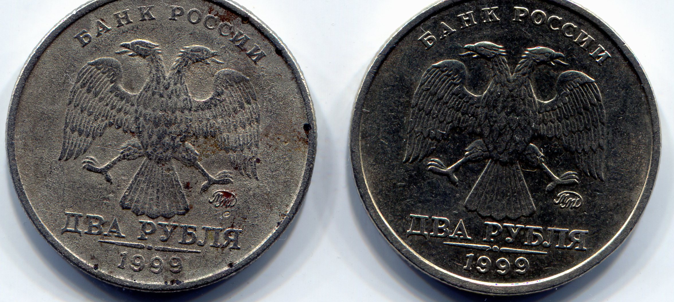 ДА , на первой монете кант уже , расстояние от надписи до канта увеличена,знак приспущен, расстояние от точки до надписи "два рубля" больше ,расстояние отканта до 1999,-больше,хвостик первой девятки укорочен ,на второй удлИнён, на первой монете расстояние от букв до низа хвоста больше. Совсем другая монета. Что скажут корифеи, и какая из них теперь не частая,а какая уникальная?