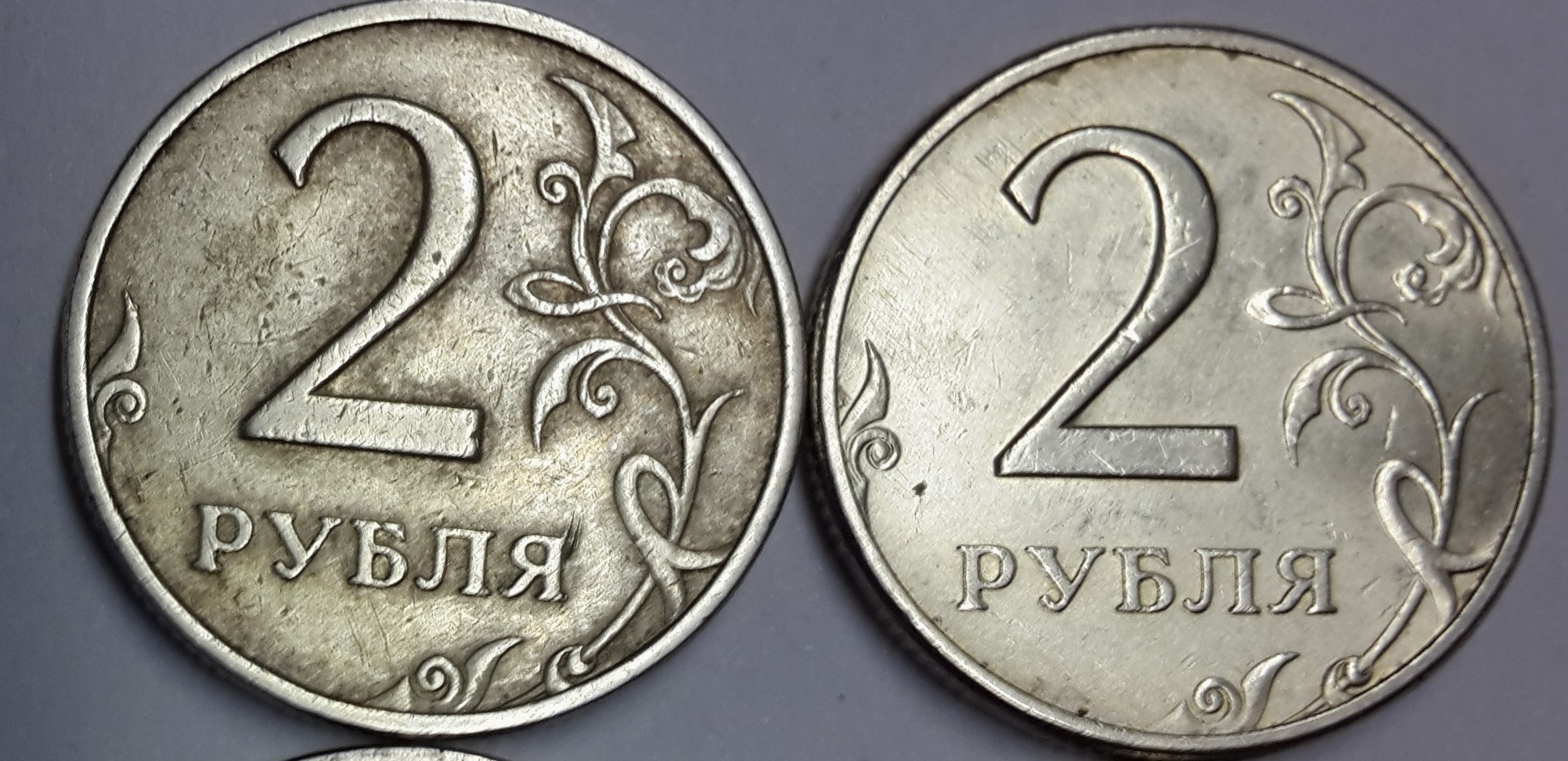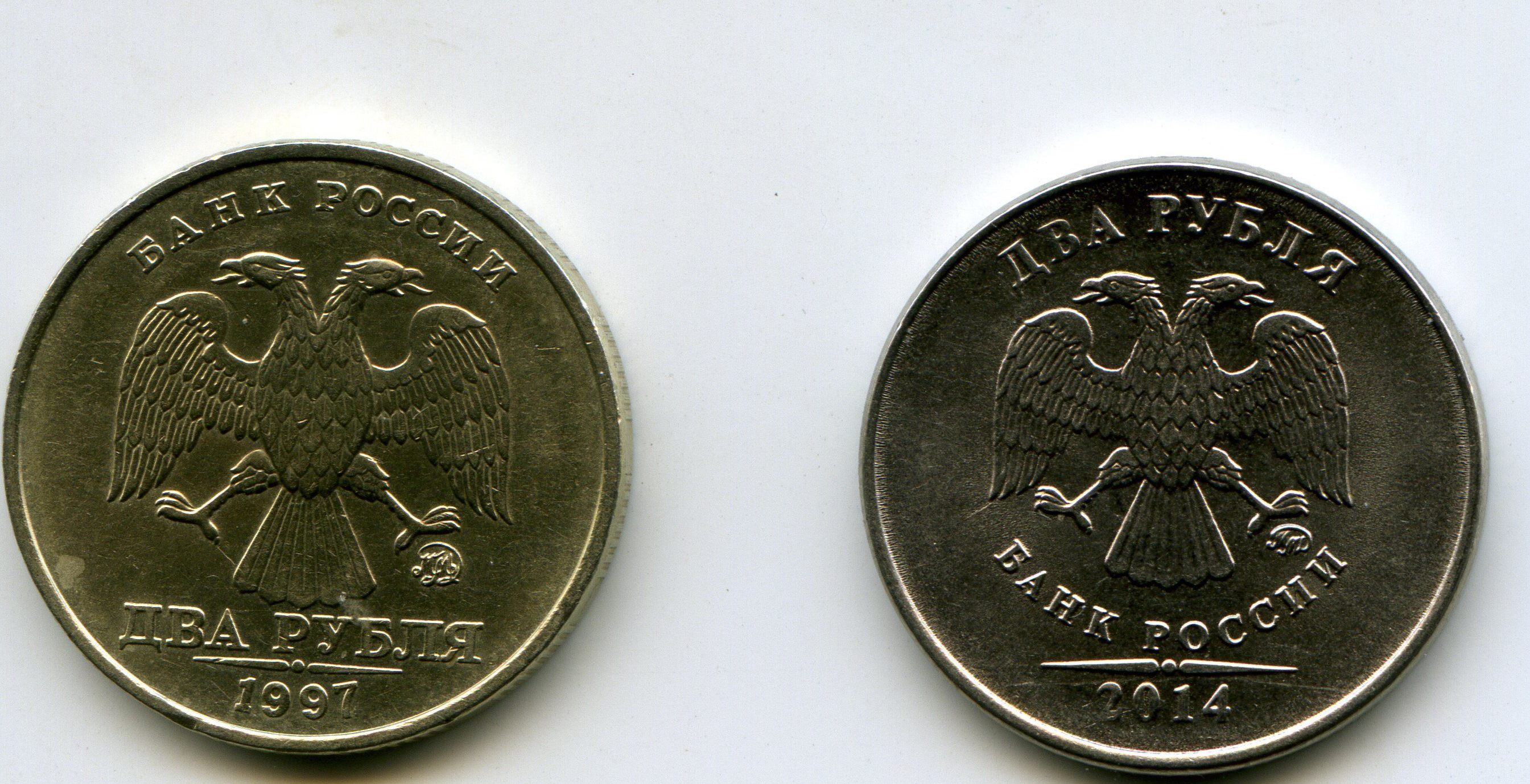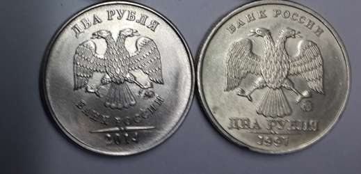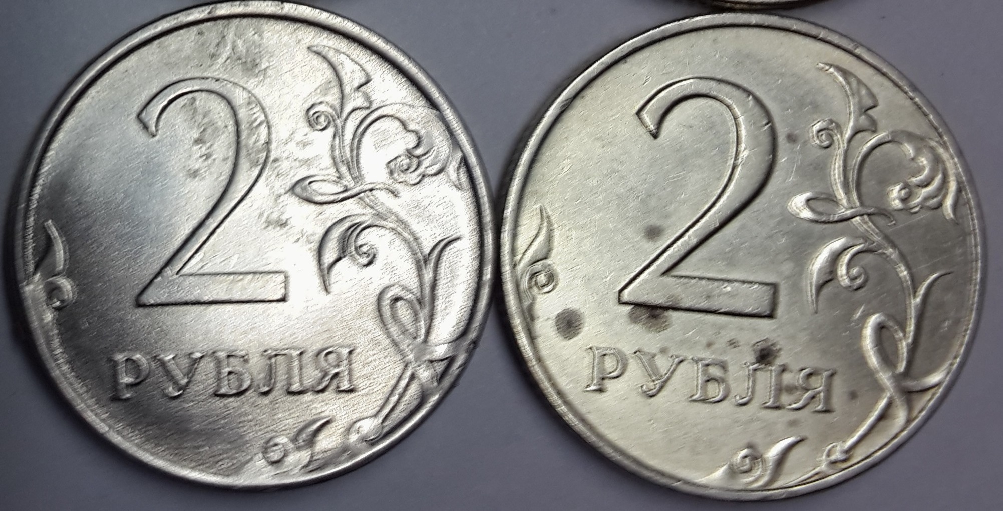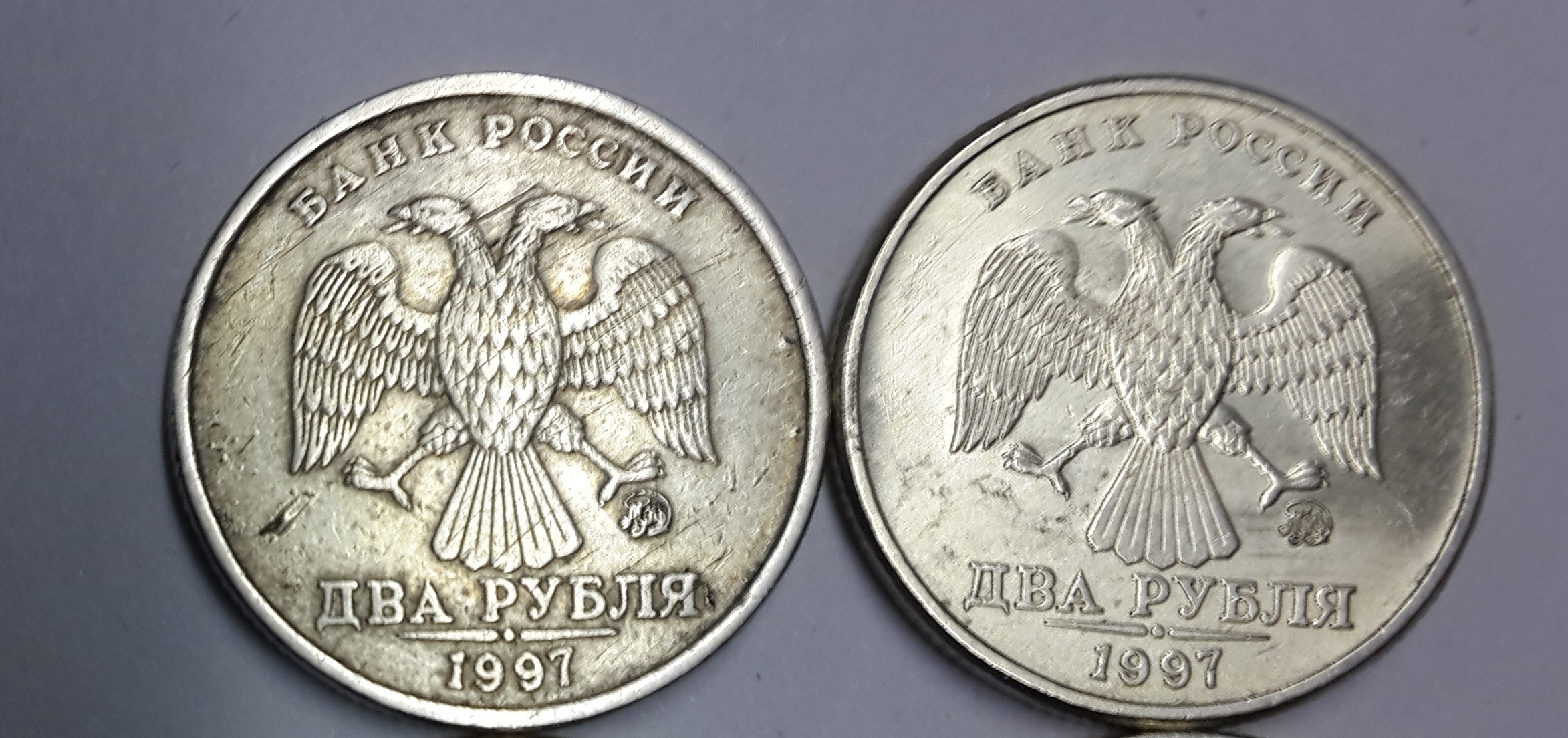 Спасибо за помощь .но вот 2 рубля 1997 - вес 5,1 .а не 3,1 с весом 1 рубля 2008 согласна.Но все равно- эти 2 рубля 1997 тяжелее. 1 рубль 2008 отливает синим цветом под освещением похоже на гальванику никелем. не смогу без помощи разобраться чем покрыты:-(