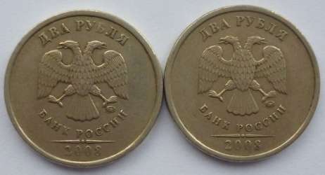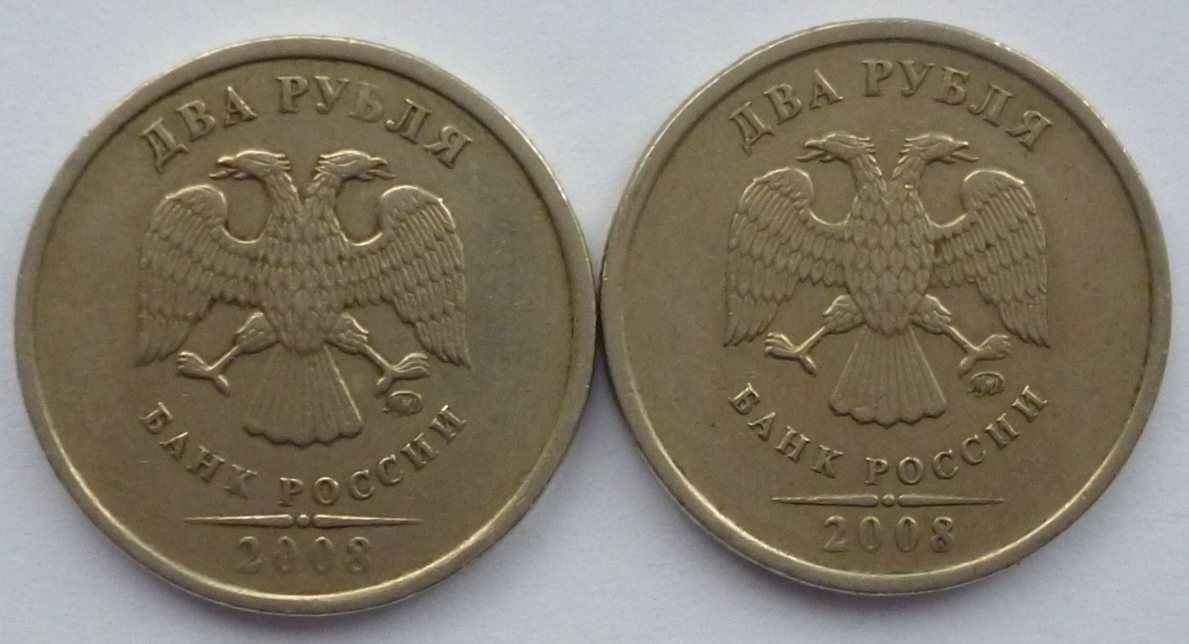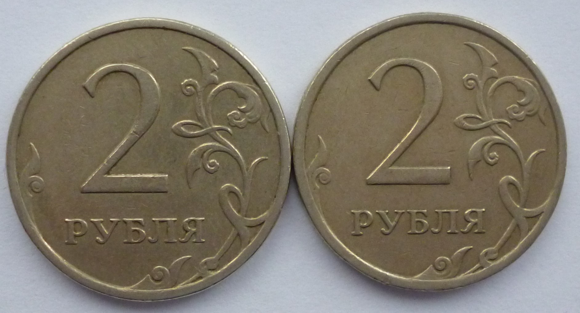 Ничего не обычного, правая монета чеканена подшлифованным штемпелем, поэтому буквы и двойка стали тоньше и менее рельефные.