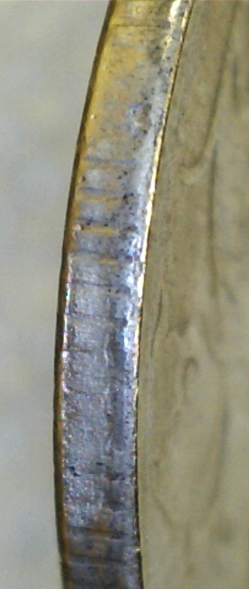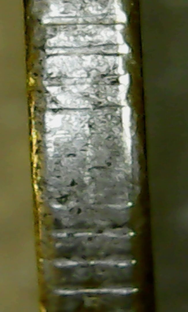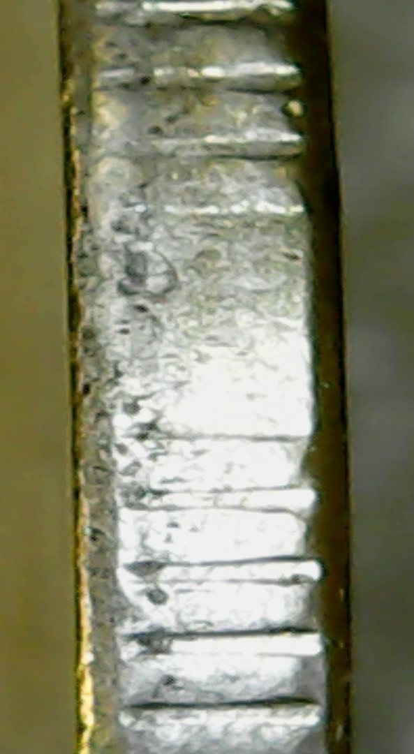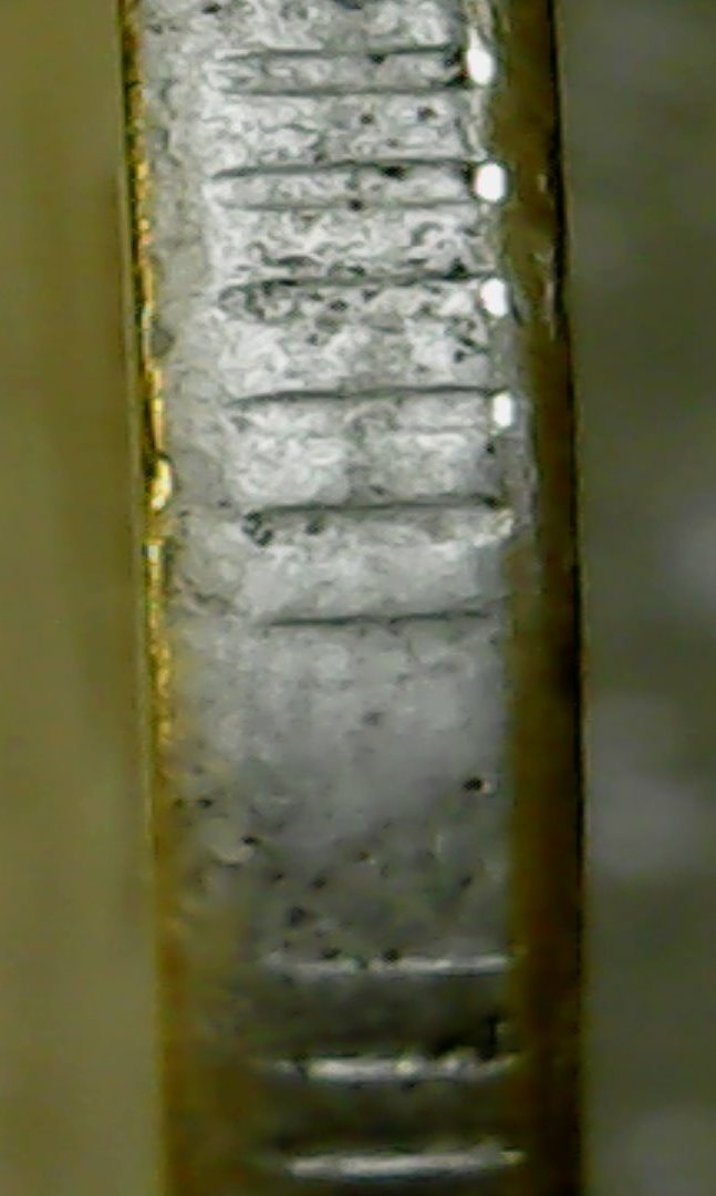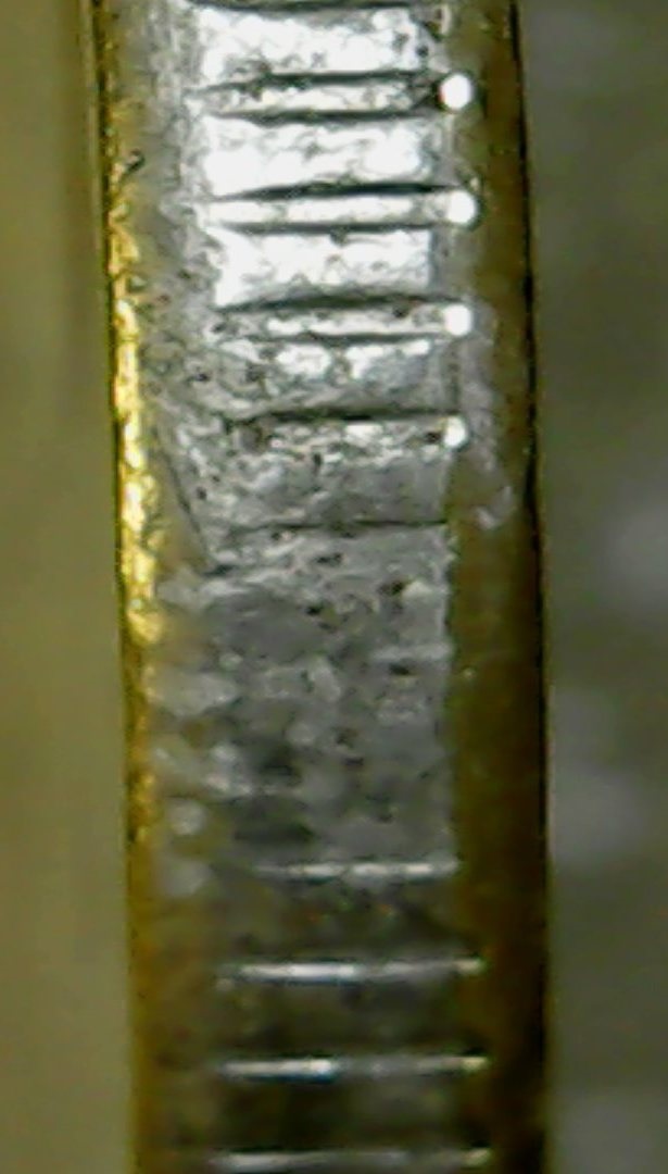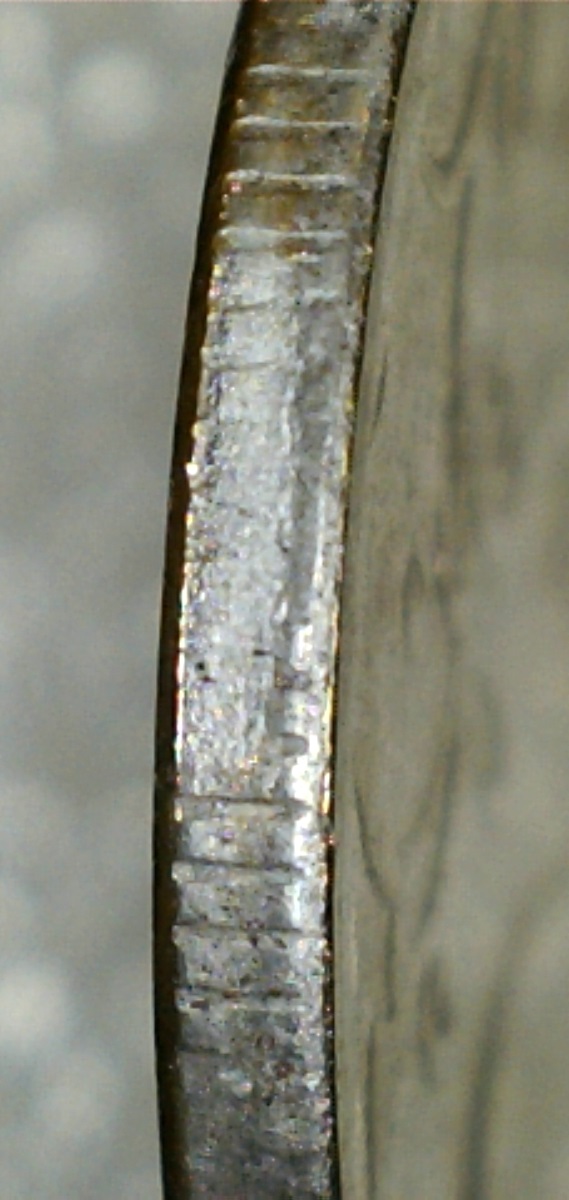 Спасибо за ответы и советы.Сделал новые фото другим ЮСБИ-микроскопом,тут вроде бы фото по понятнее.Чётко прослеживается нависание "плакироовки" над гуртом.Раствор "Универсальный для чистки монет" Leuchtturm.Монетку с гальваникой кинул,результат сообщу.Фото делал под углом.