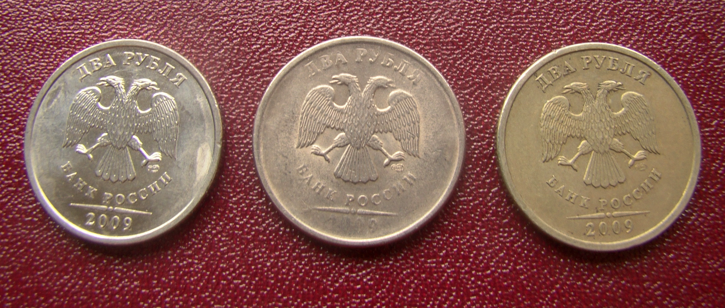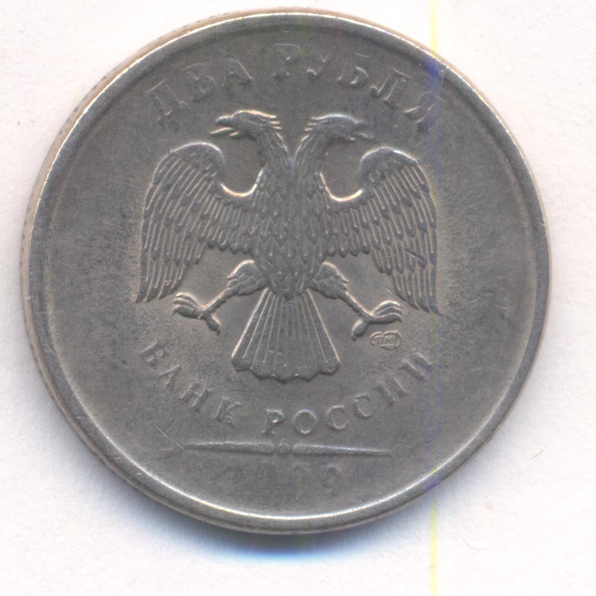 Вместо никелевого гальванопокрытия на 2 рублях 2009 спмд П-Б мельхиоровая (МН19) плакировка, покрывающая только аверс и реверс и частично заходящая на гурт. На гурте видна стальная основа, вес диаметр и толщина совпадают.