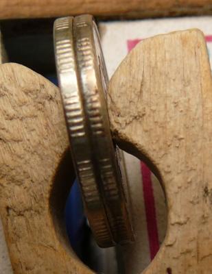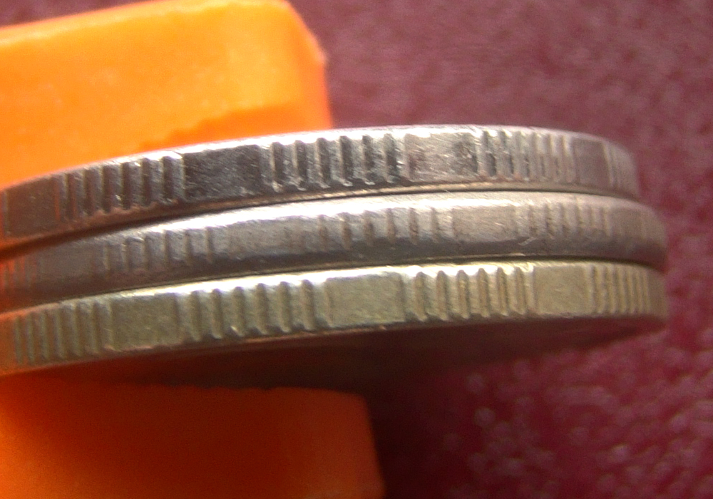 Гурты видятся разными. Цвет - откровенно стальной. По самой кромке видится небольшой (пол миллиметра примерно) слой металла не стального цвета (возможно это и есть незначительный заход плакировки). По крайней мере невооруженным глазом весь гурт видится непокрытым.