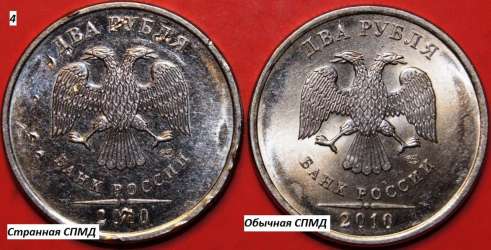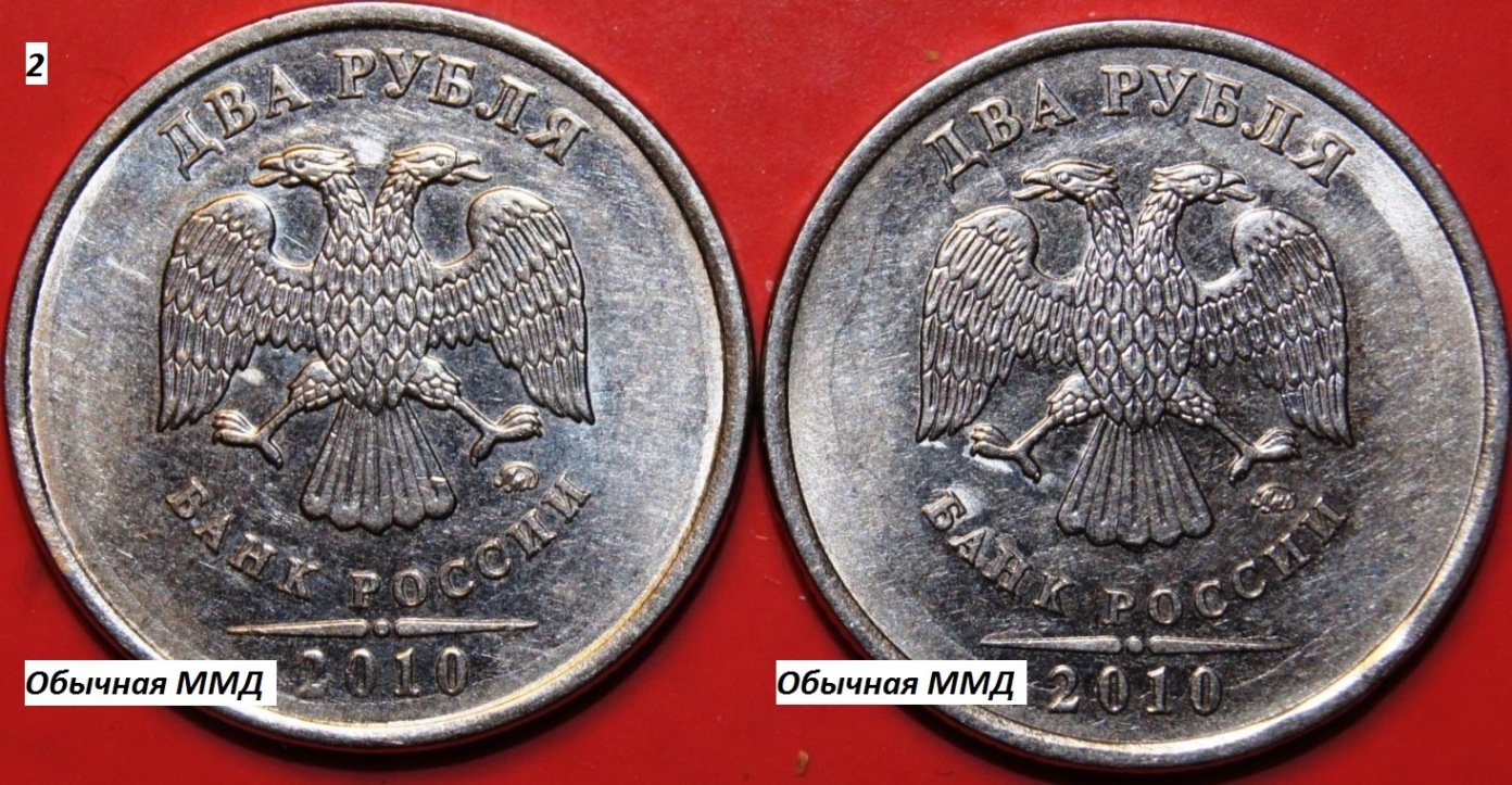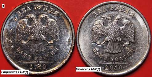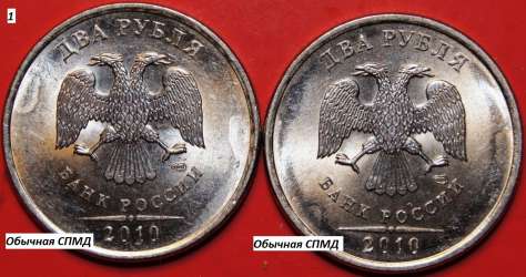 Уважаемые товарищи! Если сравнить монетку 2 рубля 2010 года СПМД и 2 рубля 2010 года ММД, то можно заметить невооруженным глазом, что они отличаются не только знаками МД, но и внешним видом заготовок, на которых отчеканены (конечно, 2-х рублевых монеток 2010 года СПМД и ММД я видел немного)... Но мне попалась одна 2-х рублевая монетка 2010 года СПМД, которая выглядит не совсем обычно и по заготовке больше похожа на 2-х рублевую монету ММД...