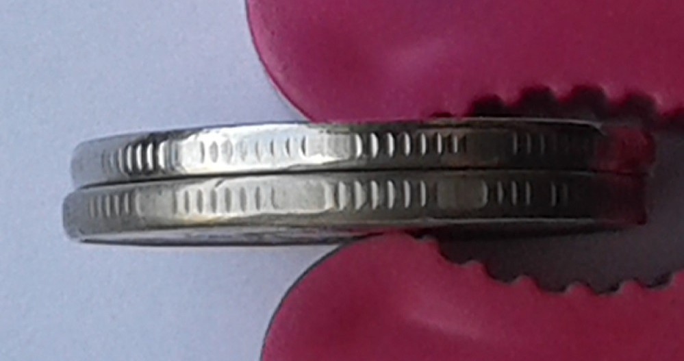 На гурте монеты редко можно увидеть какие-либо дефекты, в т.ч. и при вырубке. Никаких "хорошо видно" на гурте обжатой, а затем отчеканенной, т.е. готовой монете - нет. Вероятно, Вы путаете с царапинами от выталкивания раздавшейся в кольце монеты усилием в ~2т.