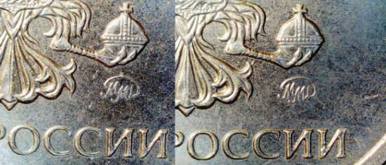 Посмотрел. Сравнил. Да, очень мелкая выкрошка присутствует, но искажение мелких деталей не наблюдается (гасты, перья и пр.). Только на знаке. Сработка штемпеля средняя, в принципе, как и на половине других монет.