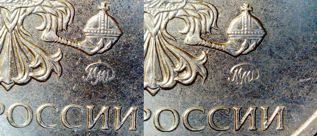 Интересная тема. До сих пор чаще обсуждался реверс сей монеты этого года (типа : ближе, дальше от канта), но здесь другое, и оно очевидно. И дело не только в 'разном' наклоне стойки, но и в самом расположении (повороте) монограммы !!!