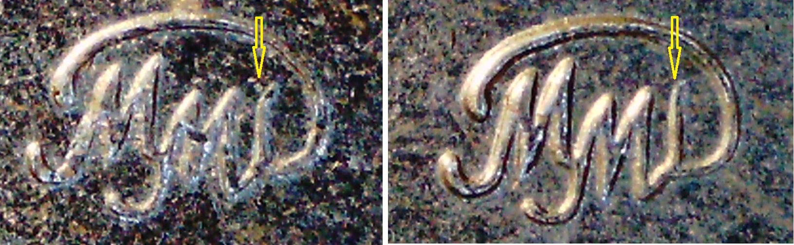 Впрочем и на показанном фрагменте хорошо видно деградацию рабочей поверхности штемпеля и, как минимум, одну её подшлифовку, после которой инструмент ещё изрядно поработал. Товарный знак на месте, отличий и отклонений нет, только наработанные в процессе чеканки.