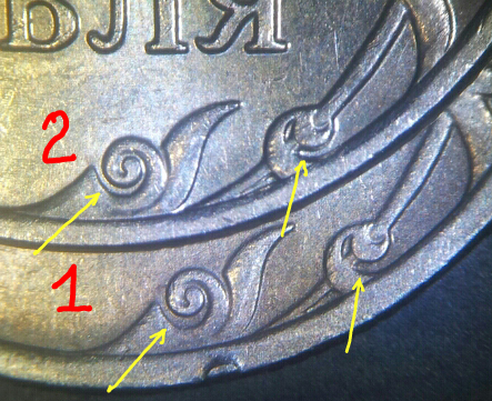 Главное: Листья справа на реверсе N1 в корне отличаются от N2 (4.12), сужение во впалости, между стеблем и кантом на 5 ч.( похожее на мачете), гораздо шире других, а волшебный завиток на 6 ч., вообще не похож ни на какие другие. И как объяснить то, что буквы в слове РУБЛЕЙ уже, а расстояние между ними больше своих одногодок??? С уважением жду комент...
