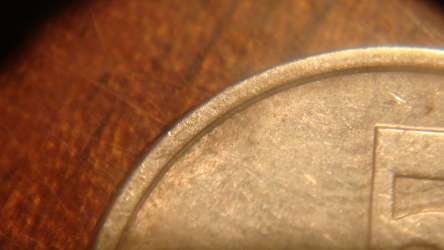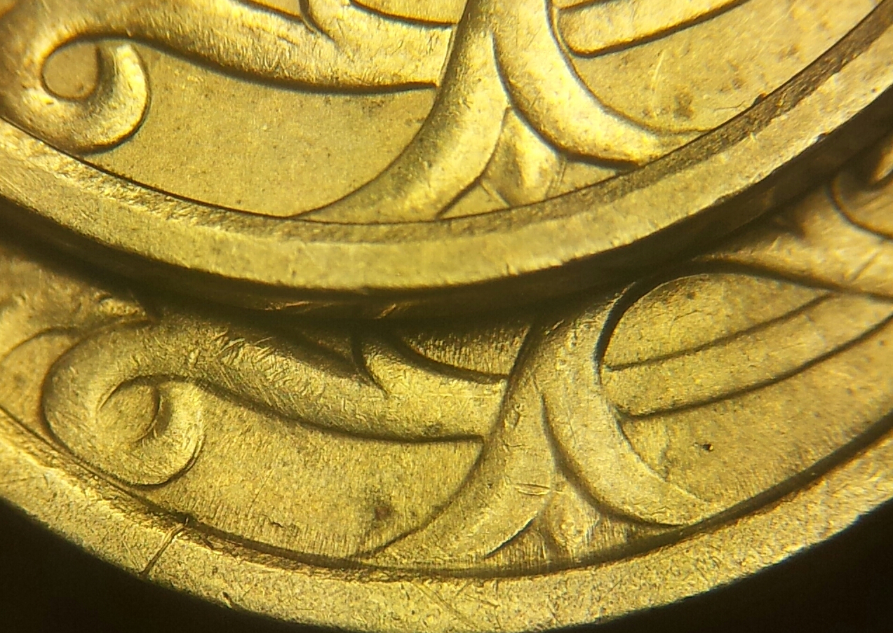 Фёдор и Геннадий, извиняюсь за позднее внедрение в тему, но у меня похожий случай. Вот фото монет- одногодок (5коп 2005 с.п). Верхняя шт.3.3.