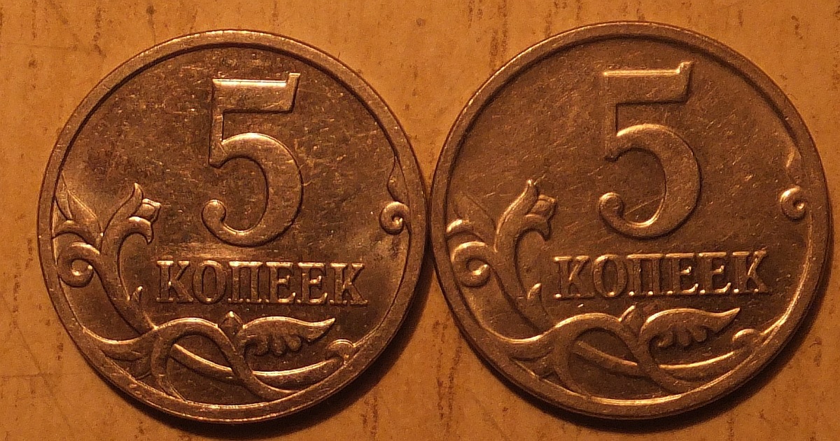 Справа, если прибегнуть к сленгу автолюбителей, мы видим убитую "копейку". Проще говоря, штемпель, которым была отчеканена эта пятикопеечная монета, находился на стадии издыхания после последней по возможности реставрации (подшлифовки). В общем, мы наблюдаем кусок колбасы, отрезанный до безнадежности затупленным ножом. В смысле, когда инструмент приходит в окончательную непригодность, его полагается утилизировать, а не насиловать, как это принято на ММД.