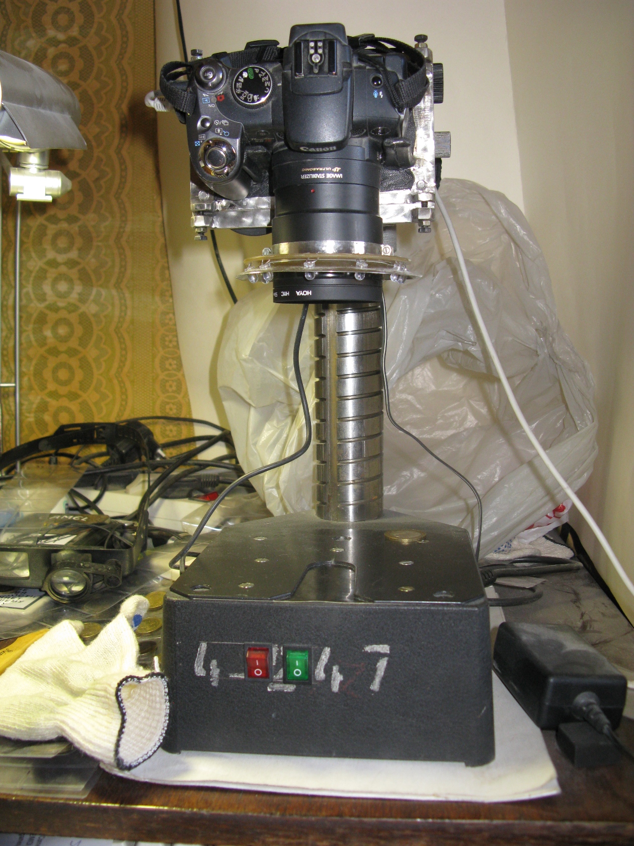 У меня аппарат не зеркалка, а Canon S5 с линзой, то при съемки двух монет рядом будет большое искажение, а так в одном режиме с управлением от компа точность установки по углу не превышает пол градуса.