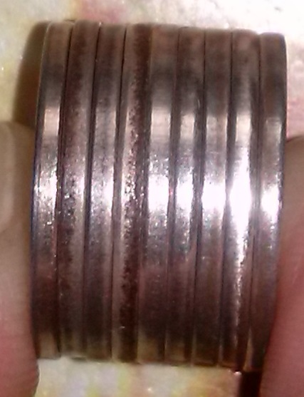 Стопочку монет теперь возьмите и где-нибудь ближе к середине вложите спорную монету. Рассмотрите гурты, у гальваники гурт более благородный и тоже выделяется.