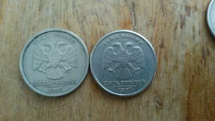 Изображение на аверсе правой монеты явно уменьшено... Однако, возможно это иллюзия, т. к. по таким фото сложно не ошибиться...